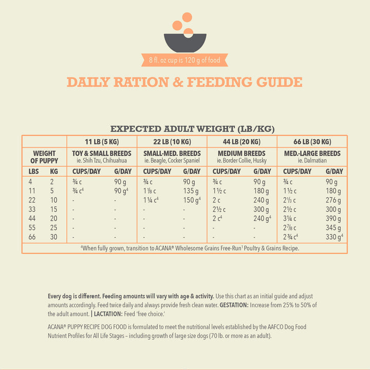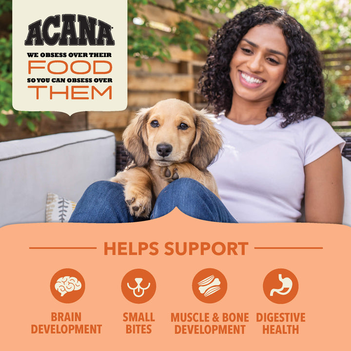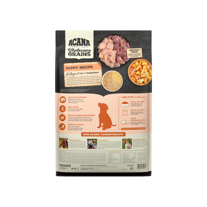This premium puppy food with grains includes DHA from fish oil to support brain and vision development, plus calcium and phosphorus to aid in building strong bones. ACANA Wholesome Grains Puppy Recipe Dry Dog Food is free from gluten, potato, and artificial preservatives—just real food for real progress.