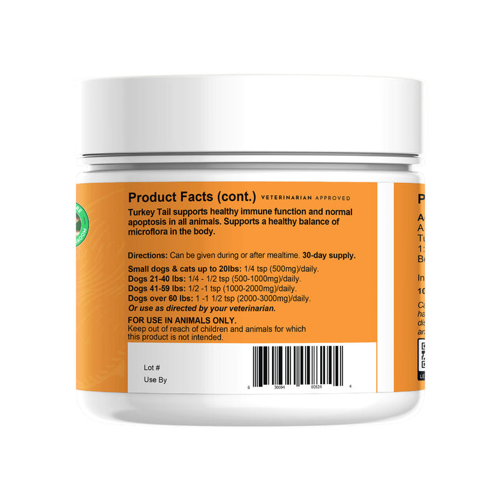 Formulated to support daily immune health, this powder supplement features turkey tail mushroom for cats & dogs—a powerful, antioxidant-rich ingredient known for promoting cellular function and vitality in pets.