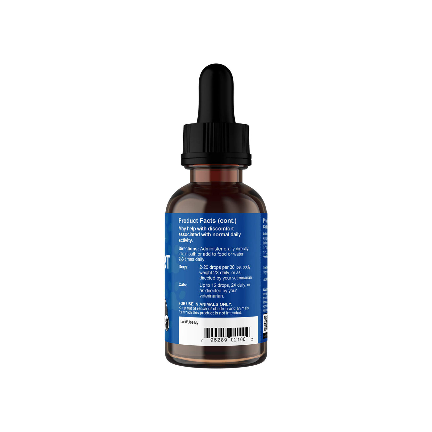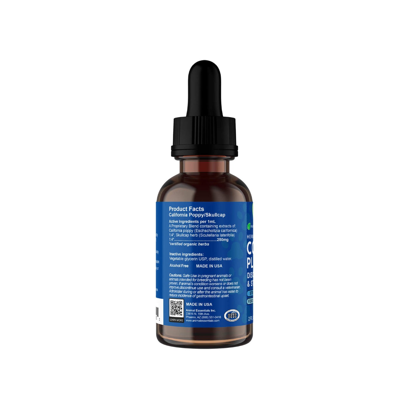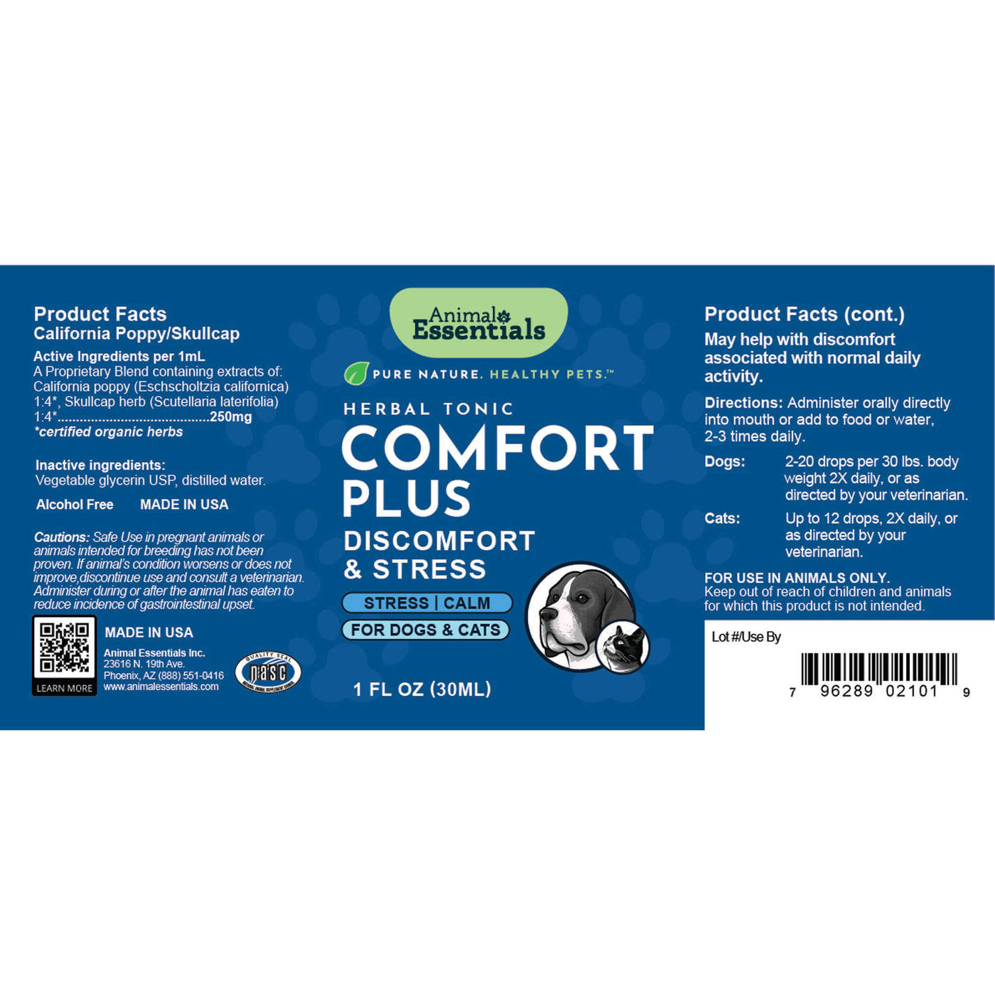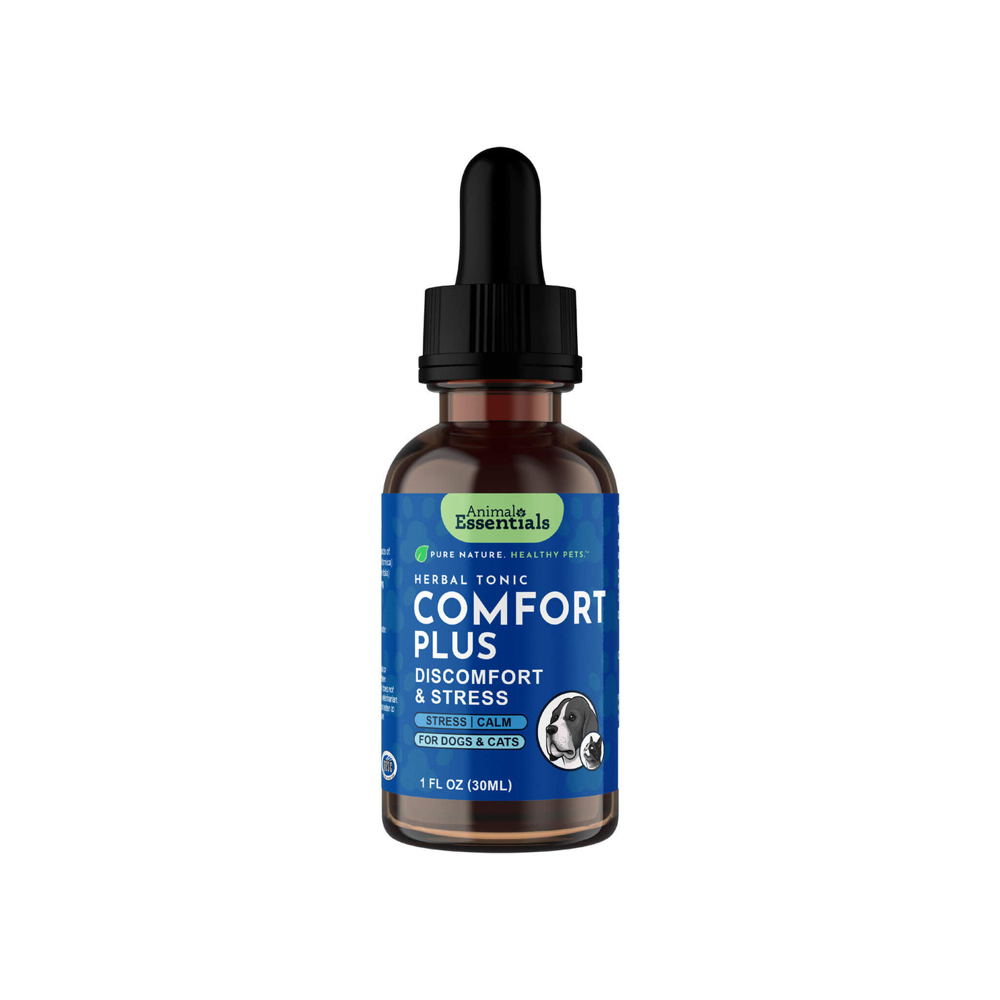 Each bottle contains 1 oz (30 ml) of Animal Essentials liquid Comfort Plus. Made with sustainable, organic ingredients, including California poppy and skullcap. Perfect for cats and small dogs.