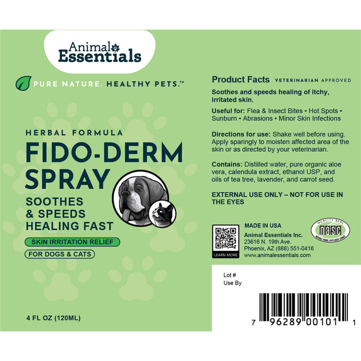 Each bottle contains 4 fl oz of Animal Essentials Fidoderm Herbal Spray. Made with sustainable ingredients, including organic aloe vera, calendula, and oils of tea tree, lavender, and carrot seed.