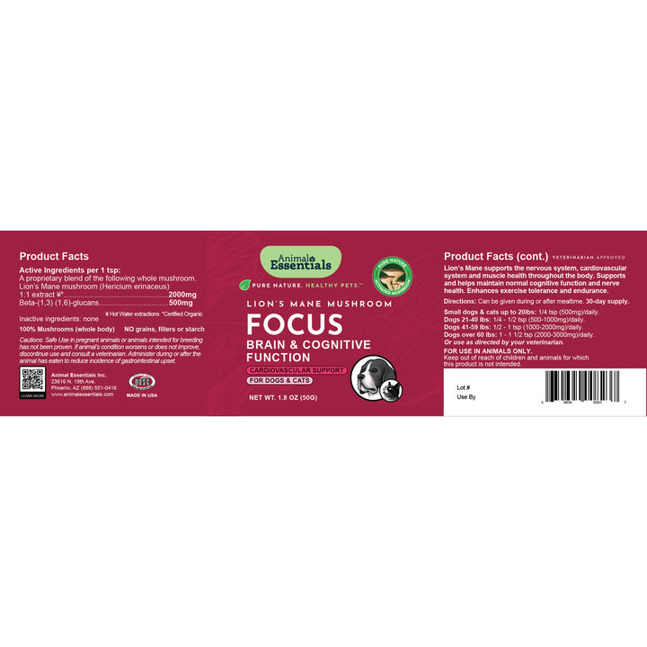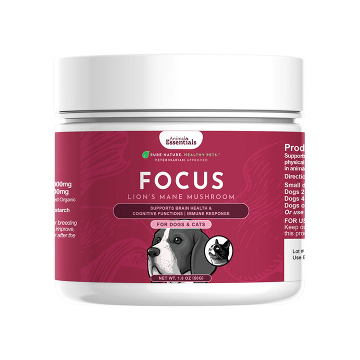 Support long-term focus and clarity with Animal Essentials FOCUS Mushroom Powder—a powerful lion's mane dog & cat supplement made for healthy minds.
