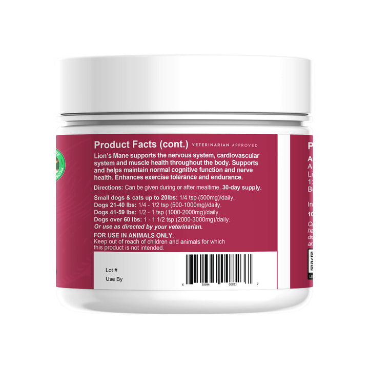 Lion's Mane mushrooms, designed to support brain health and cognitive function in pets of all ages.