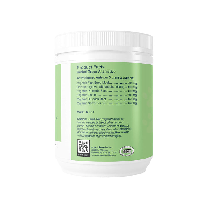Each jar contains 10.6 oz (300 grams) of Animal Essentials powder Herbal Green Alternative. Made with sustainable, certified organic ingredients, including flax seed meal, spirulina, pumpkin seed, garlic, burdock root, and nettle leaf.