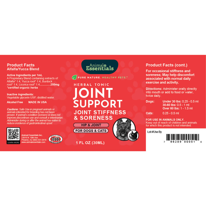 Animal Essentials Joint Support is alcohol-free and made with human-grade ingredients, ensuring a gentle yet effective approach to joint health. Its liquid form allows for easy administration, making it suitable for pets of all ages.
