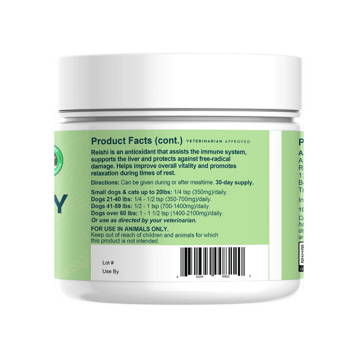 Formulated with organic reishi mushroom for dogs & cats, this daily powder helps support immune balance, vitality, and healthy aging. Rich in antioxidants and polysaccharides, reishi is a time-honored mushroom used to promote resilience and longevity in pets.
