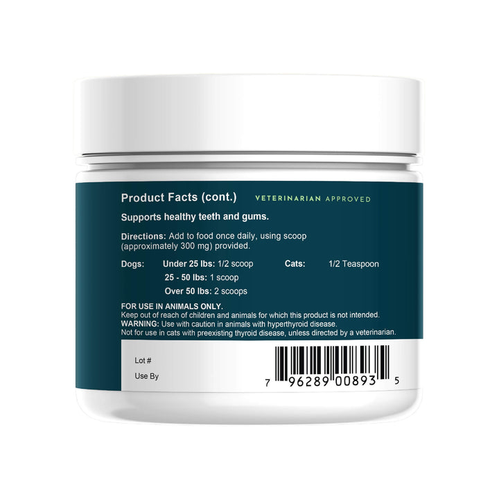 Formulated to promote clean teeth and fresh breath, this dental powder combines enzymes with sustainably harvested kelp for dogs teeth. It works systemically through saliva to help reduce plaque buildup and maintain a healthy oral environment.