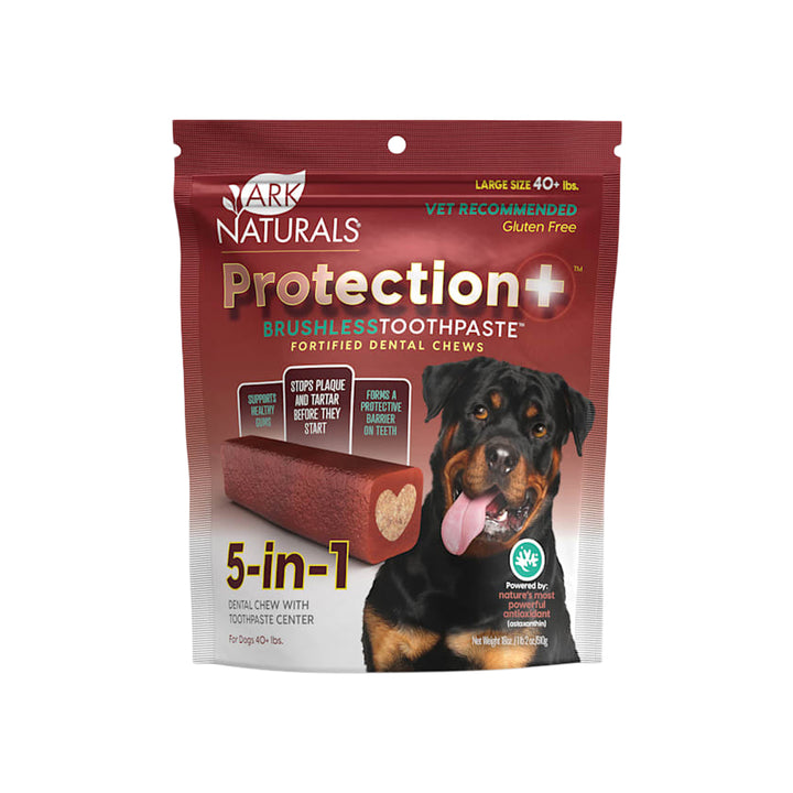 Ark Naturals Natural Protection+™ Brushless Toothpaste is a revolutionary dental chew crafted with Astaxanthin for unparalleled oral care. This innovative formula prevents plaque and tartar buildup by preventing them from adhering to your pet's teeth, ensuring optimal dental health from the start. With a toothpaste center, these chews also support polished teeth, fresher breath, and maintain healthy gums. Plus, they promote oral immune health for comprehensive oral care. Ranked Medium on our DENTA-METER™, these chews are ideal for your everyday chewer. Crafted in the USA and free from artificial flavors or colors, Ark Naturals Natural Protection+™ Brushless Toothpaste offers a natural and effective solution for your pet's dental hygiene.