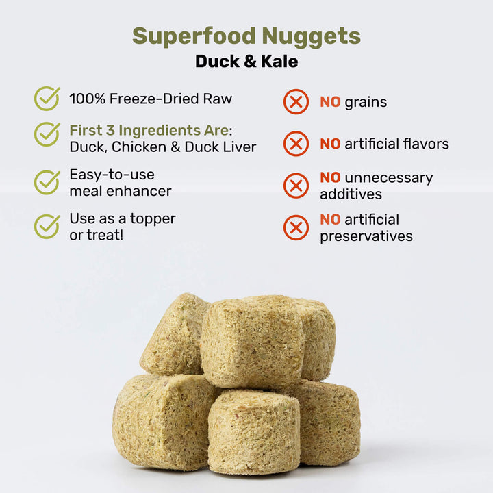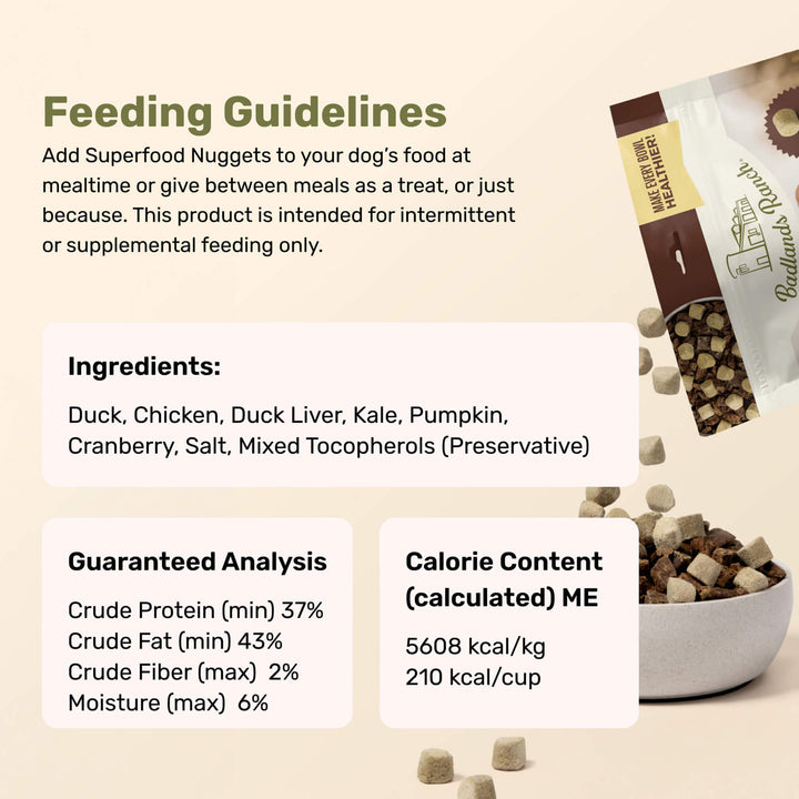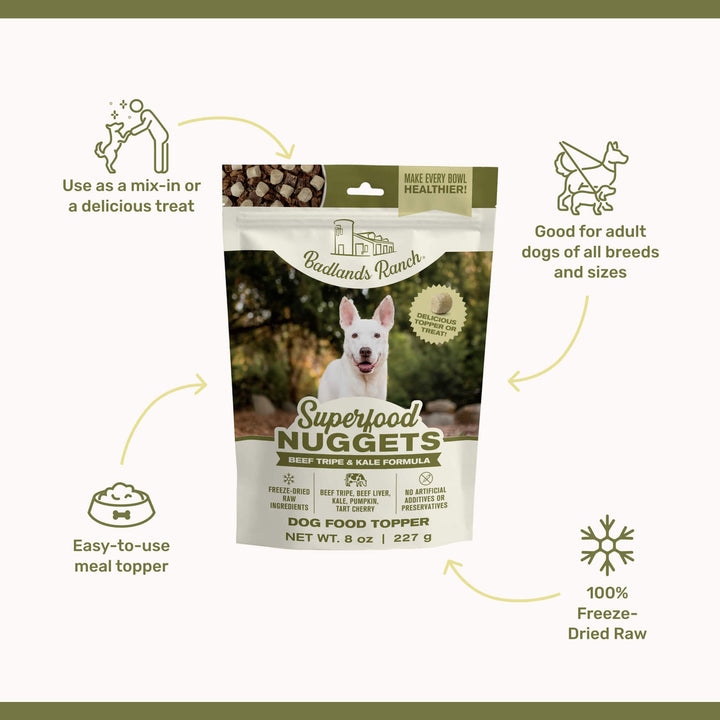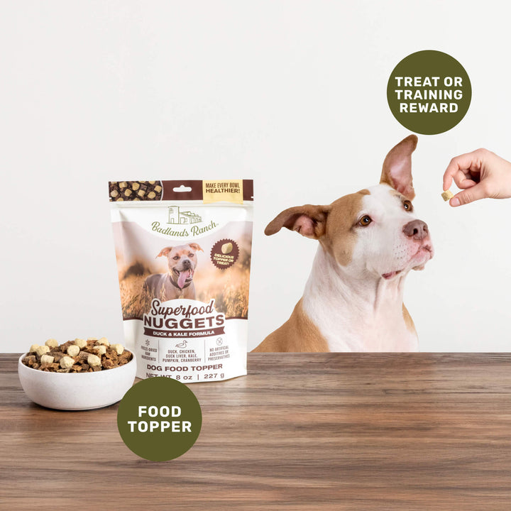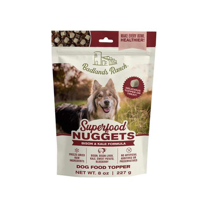 Upgrade mealtime with Badlands Ranch Superfood Nuggets Dog Food Topper—an easy, flavorful way to add raw nutrition and irresistible taste to your dog’s daily routine.