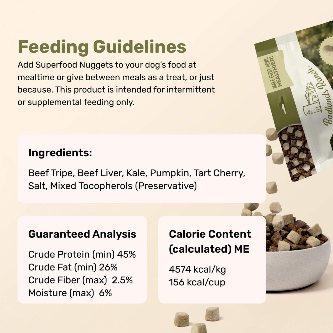 A rich blend of beef tripe and beef liver delivers bold, meaty flavor, balanced with nutrient‑dense kale, pumpkin, and tart cherry for a hearty, crave‑worthy topper.Country of origin: USAManufacturer: Badlands Ranch - Ingredients