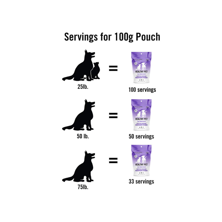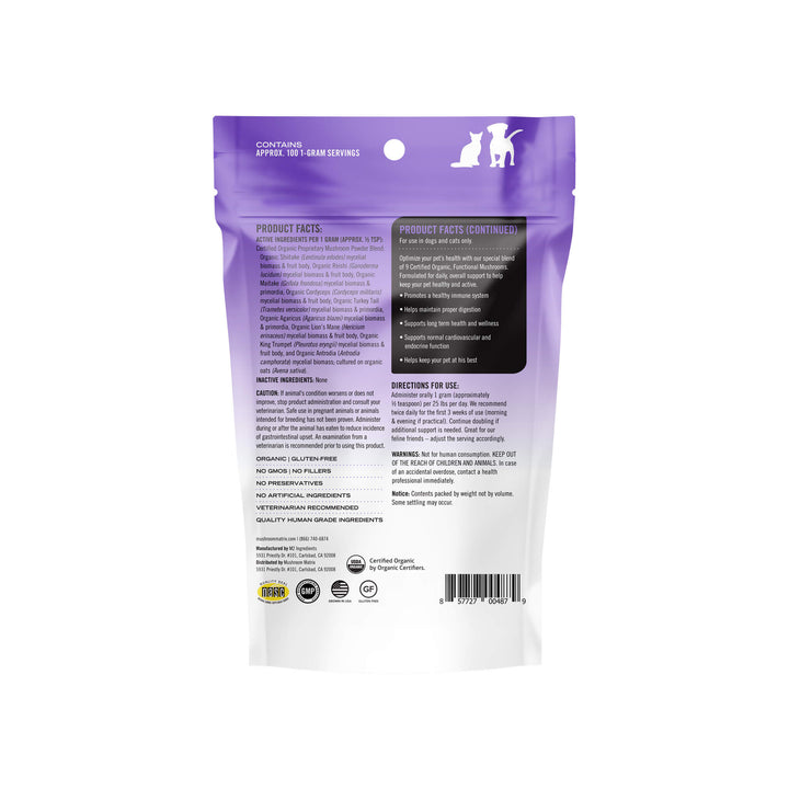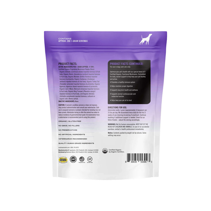 Each mushroom supplement for dogs contains a proprietary blend of eight certified 100% Organic mushroom mycelial biomass cultured on organic oats. Shiitake, Maitake, Turkey Tail, Lion’s Mane, King Trumpet, and Antrodia camphorate are all blended together in a resealable pouch. It features beta-glucans to support immune function; prebiotics and enzymes to encourage healthy digestion; as well as super antioxidants that promote cellular health.