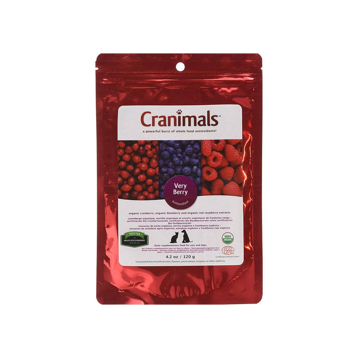 CRANIMALS Very Berry is made from certified organic blueberries, cranberries, and red raspberries, three of the world's healthiest fruits. Scientific studies show that the polyphenols in these berries support a healthy inflammatory response. Anthocyanidins found in cranberries and blueberries naturally support urinary tract and oral health in companion animals. CRANIMALS Very Berry delivers a synergistic combination of antioxidants, to help support your pet's immune system as it deal with harmful oxidants called free radicals, which damage cells, tissues and arteries.