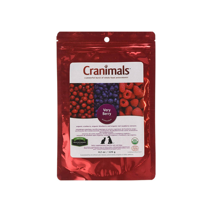 CRANIMALS Very Berry is made from certified organic blueberries, cranberries, and red raspberries, three of the world's healthiest fruits. Scientific studies show that the polyphenols in these berries support a healthy inflammatory response. Anthocyanidins found in cranberries and blueberries naturally support urinary tract and oral health in companion animals. CRANIMALS Very Berry delivers a synergistic combination of antioxidants, to help support your pet's immune system as it deal with harmful oxidants called free radicals, which damage cells, tissues and arteries.