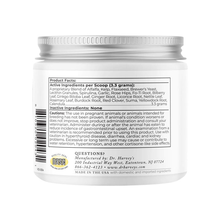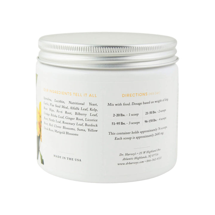 Dr. Harvey’s Golden Years Whole Food & Herb Geriatric Supplement for Senior Dogs is specially formulated for dogs over 7 years old, providing an herbal fountain of youth. Dr. Harvey believes that with the right combination of vitamins, minerals, and herbs, dogs can maintain their health well into their teens and beyond. This powerful supplement helps the body maintain its ability to fight disease and may increase longevity.