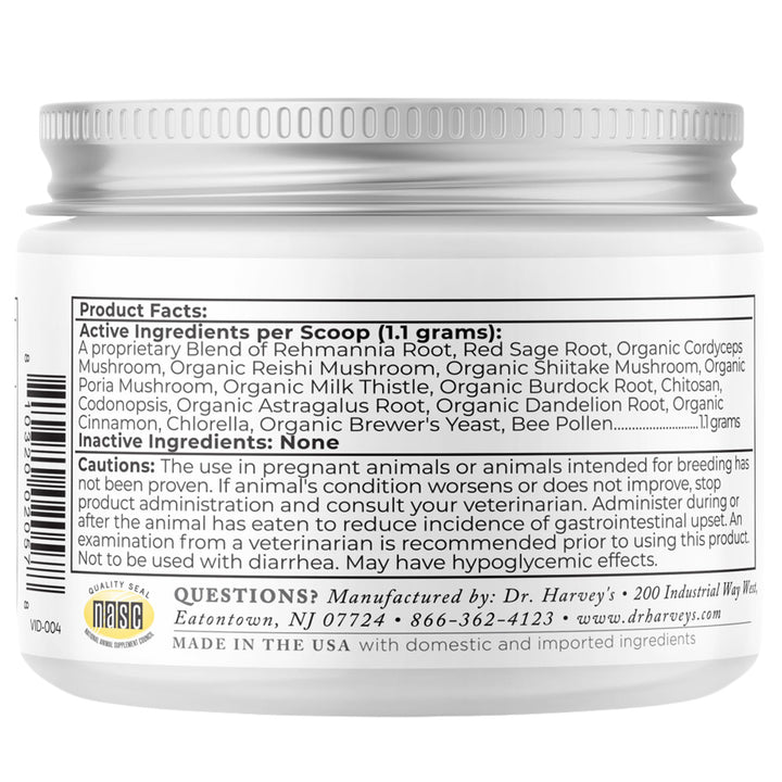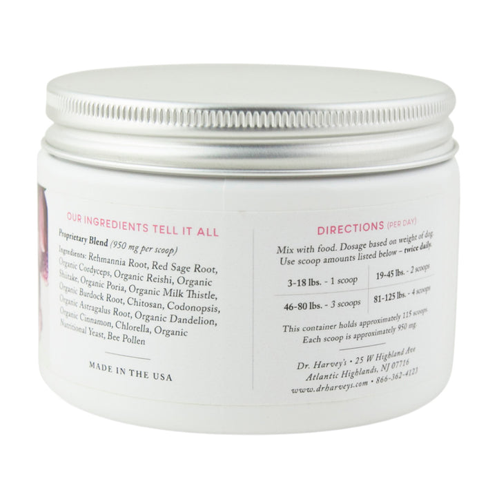 Dr. Harvey's Kidney Health Supplement for Dogs is a herbal and mushroom blend meticulously designed to aid and support your dog’s kidney health. Enriched with a combination of potent ingredients like Rehmannia Root, Organic Reishi, Organic Shiitake, Organic Poria, Organic Cordyceps, and Organic Astragalus Root, this supplement provides holistic kidney support, tonifying and enhancing overall health. The inclusion of Codonopsis further contributes to immune boosting, urinary health, and overall kidney well-being.