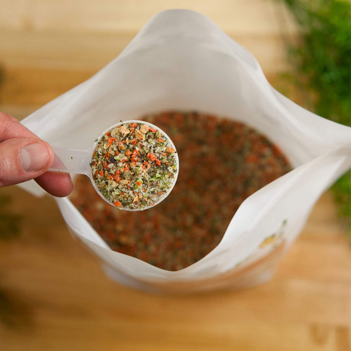 Veg-to Bowl is easy to use! Just add Veg-to-Bowl Dehydrated Whole Food daily to your companions meals. You can mix Veg-to-Bowl with any natural food that you are currently feeding. Simply mix with your choice of protein and oil for a healthy homemade meal that’s super easy to prepare. Veg-to-Bowl is also a great addition for those who are feeding a raw diet to their companions. Any way that you feed Veg-to-Bowl your companion will thank you!