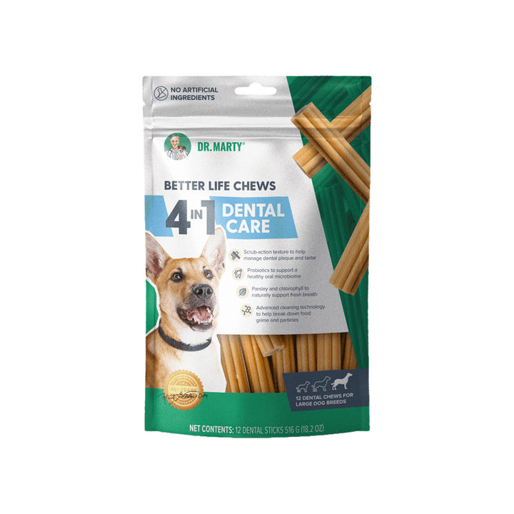 Dr. Marty Better Life Chews 4-in-1 Dental Care Dog Dental Chew Sticks are an easy and effective way to freshen your dog's breath while promoting oral health. These advanced chews use micro-scrubbing enzymes to break down plaque, premium probiotics to support gum health, and natural chlorophyll to neutralize bad breath.