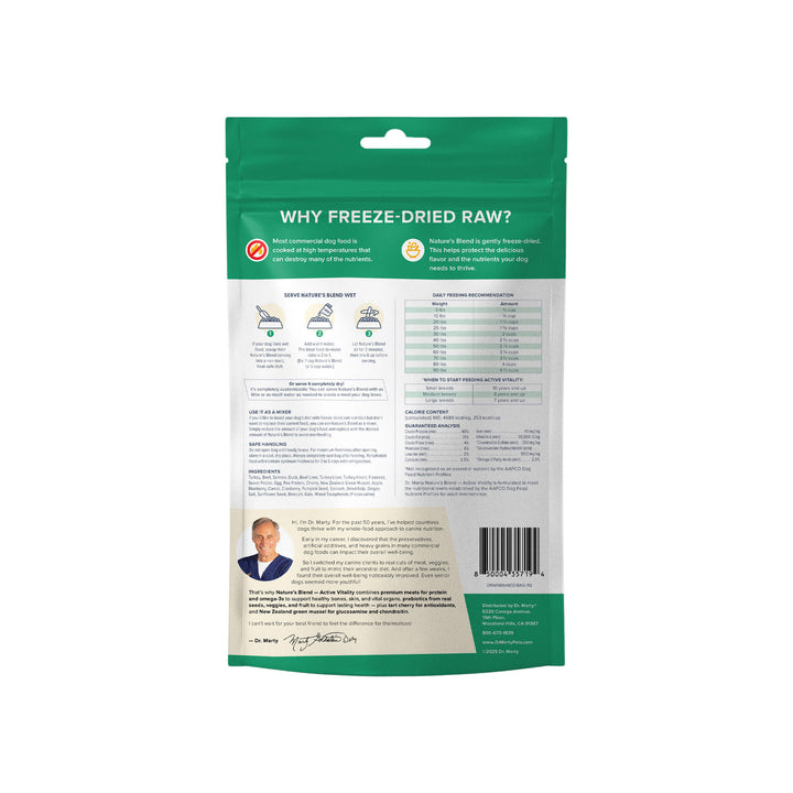 Dr. Marty Nature’s Blend Active Vitality Freeze Dried Dog Food is designed with aging dogs in mind, focusing on ingredient quality and balanced nutrition for later life stages. As a freeze dried senior dog food, the recipe combines meats, organ meats, fruits, vegetables, and seeds to provide a diverse whole-food ingredient profile. The formula reflects a straightforward approach to feeding senior dogs without unnecessary fillers or complicated additions. Explore additional nutrition solutions from Dr. Marty to support different life stages and needs.