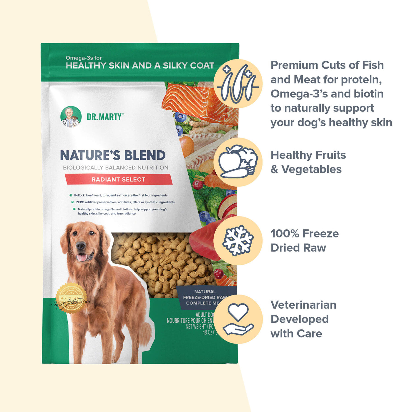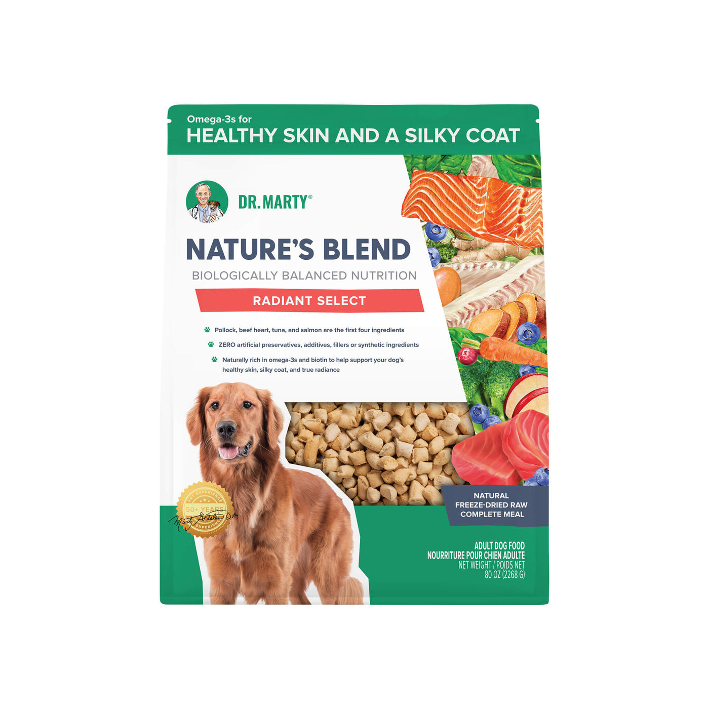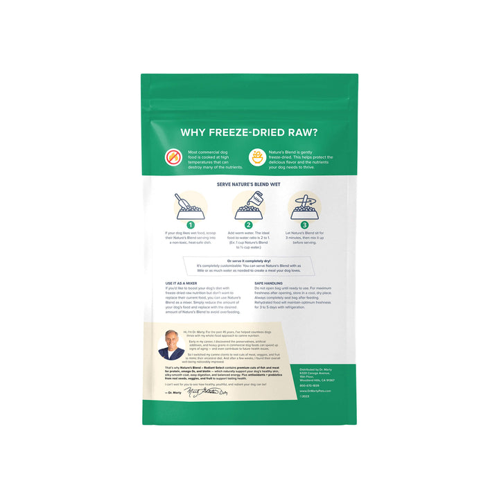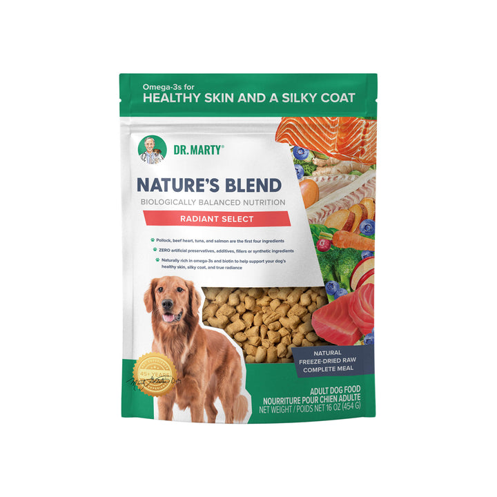 Elevate mealtime with Dr. Marty Nature's Blend Radiant Select Freeze Dried Dog Food and bring purposeful, skin-forward nutrition to your dog’s bowl.