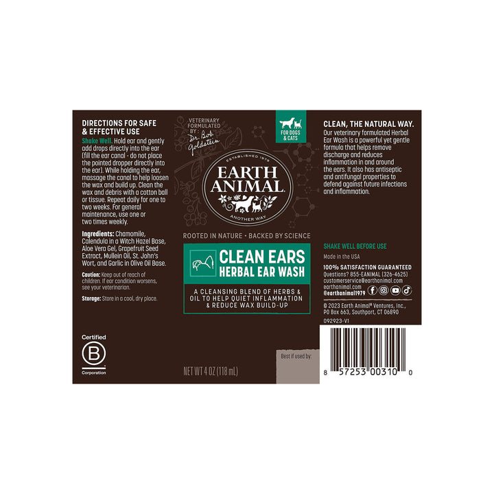Earth Animal Clean Ears Wash – Natural Herbal Ear Cleaner for Dogs