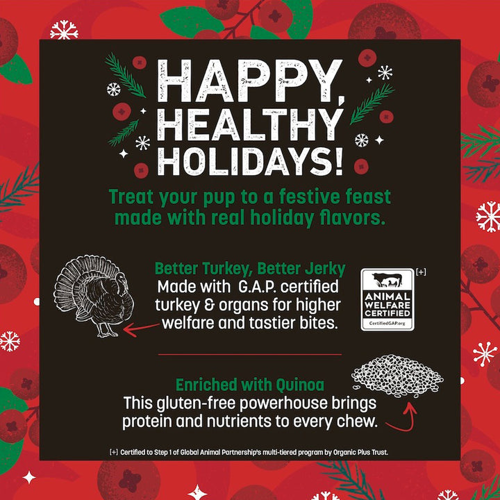 Earth Animal Holiday Wisdom Jerky Dog Treat is a seasonal holiday treat for dogs crafted with thoughtfully sourced ingredients and festive flair. Air-dried in small batches, this chewy jerky delivers high-value flavor and nutrition in a format dogs love.