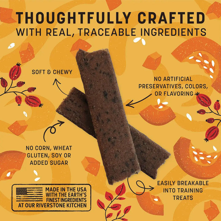 Warm and aromatic with cozy hints of pumpkin and cinnamon, this seasonal jerky offers a soft chew and a comforting flavor perfect for fall.Country of origin: USAManufacturer: Earth Animal - Ingredients