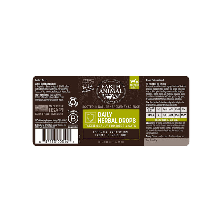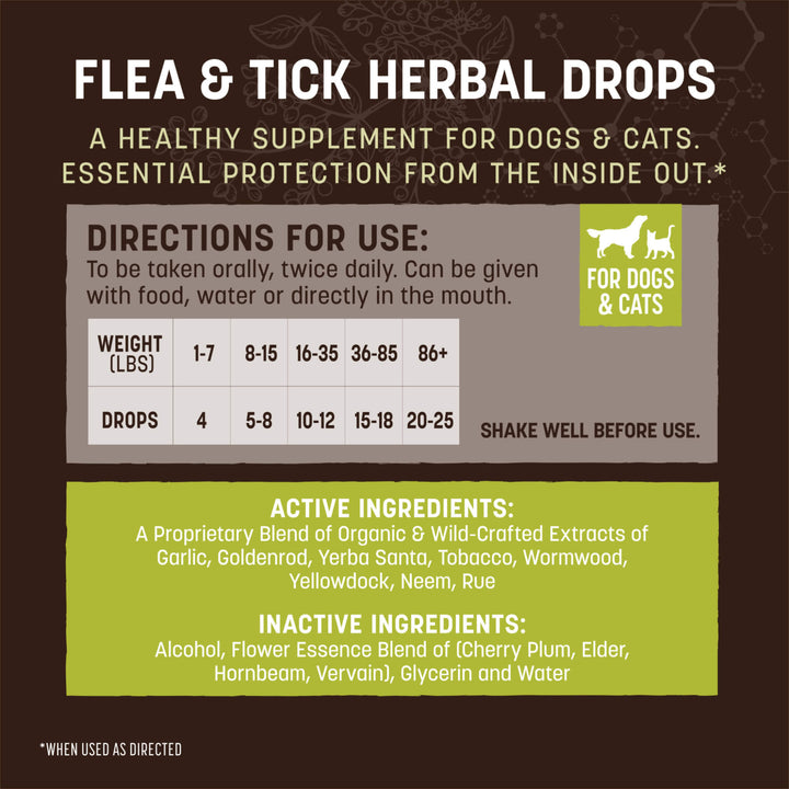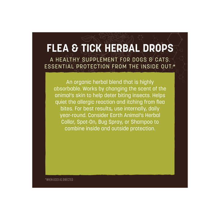 Simply add a few drops to your pet's meals, water, or directly in their mouth twice daily. Earth Animal Herbal Flea & Tick Drops are formulated with natural ingredients creating a safe, effective insect repellent that is safe for you, your pet and the environment!