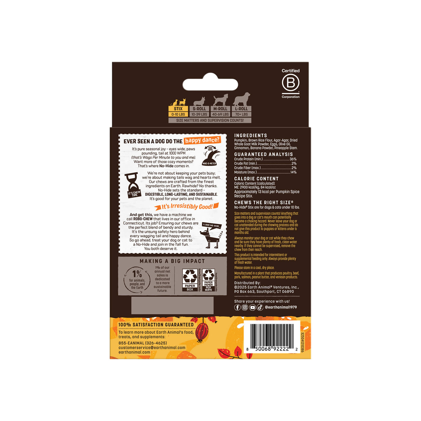 Earth Animal No-Hide Holiday Stix Dog & Cat Chews bring festive flavor and safe, long-lasting chewing together for the holidays. These seasonal flavor chews for dogs & cats are crafted with limited, wholesome ingredients to create a digestible alternative to rawhide.