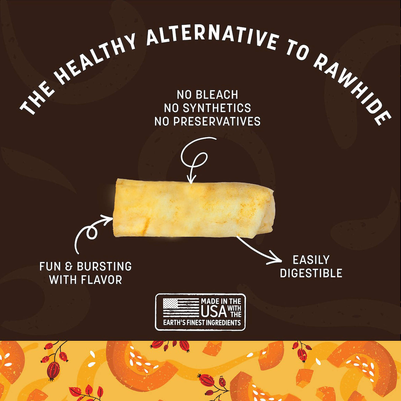 Earth Animal No Hide Pumpkin Spice Seasonal Rolls are festive pumpkin spice dog treats crafted with clean, recognizable ingredients. These rawhide-free chews are air-dried to create a long-lasting, satisfying texture that supports dental health and chewing enjoyment.
