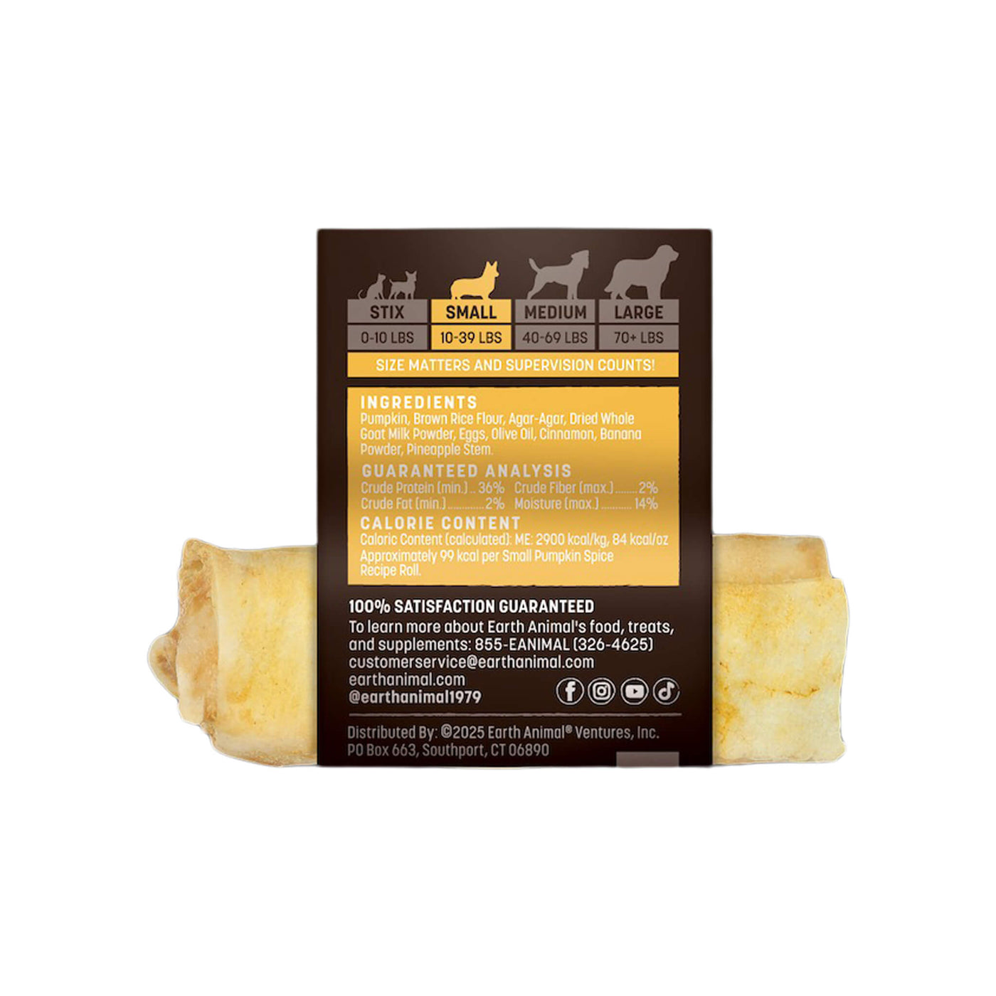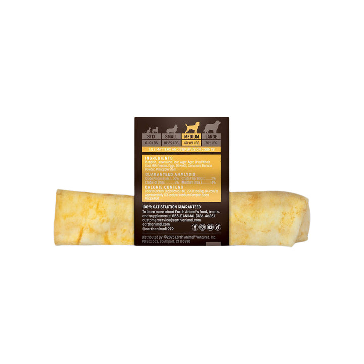 Warm and festive with notes of pumpkin, cinnamon, and creamy goat’s milk, this seasonal chew delivers a flavorful experience dogs can savor all fall long.Country of origin: USAManufacturer: Earth Animal - Ingredients