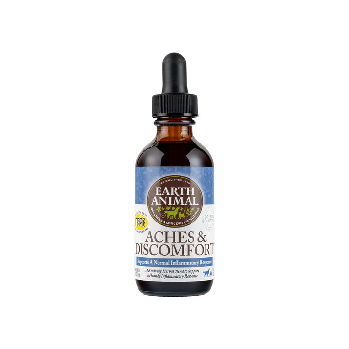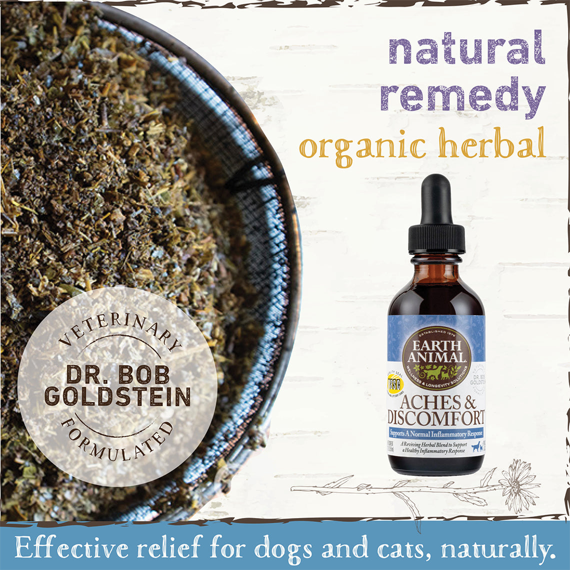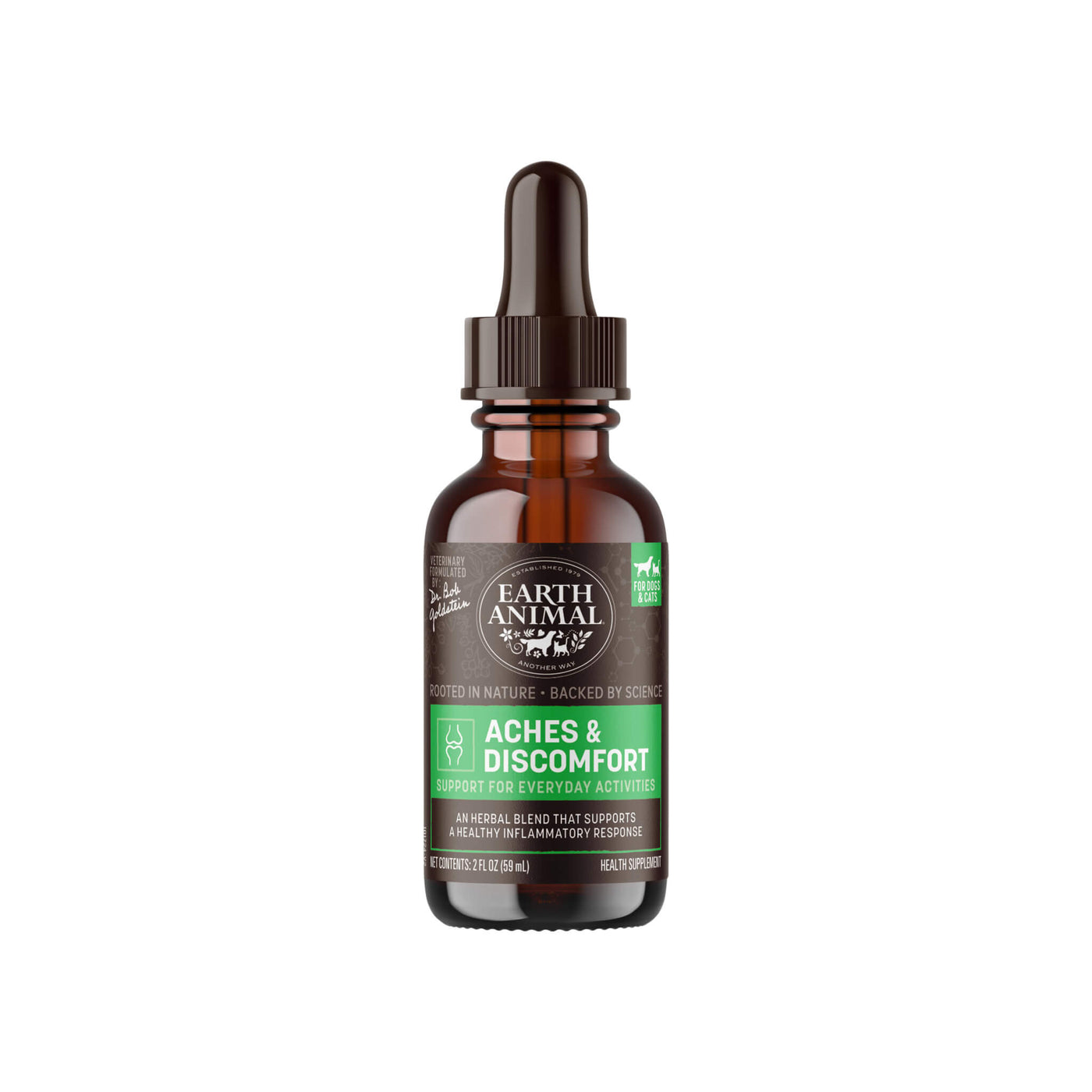 Earth Animal Organic Herbal Remedies Aches & Discomfort Tincture for Dogs offers another way to heal with a reviving, organic herbal blend that may help relieve inflammation associated with normal daily exercise and activity while also supporting the structural integrity of joints and connective tissue.
