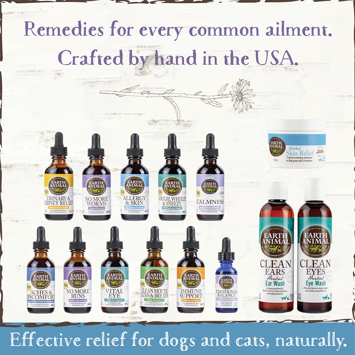 Hand-crafted in the Green Mountains of Vermont, Earth Animal's Herbal Remedies are made with plants that contain naturally occurring beneficial properties providing healing, comfort, and wellness for the most common conditions dogs and cats experience such as aches & discomfort, allergy & skin issues, anxiety, stress, nervousness, oral health, bad breath, coughing, wheezing, sneezing, immune support, diarrhea, worms, urinary support, kidney support, and eye irritation.