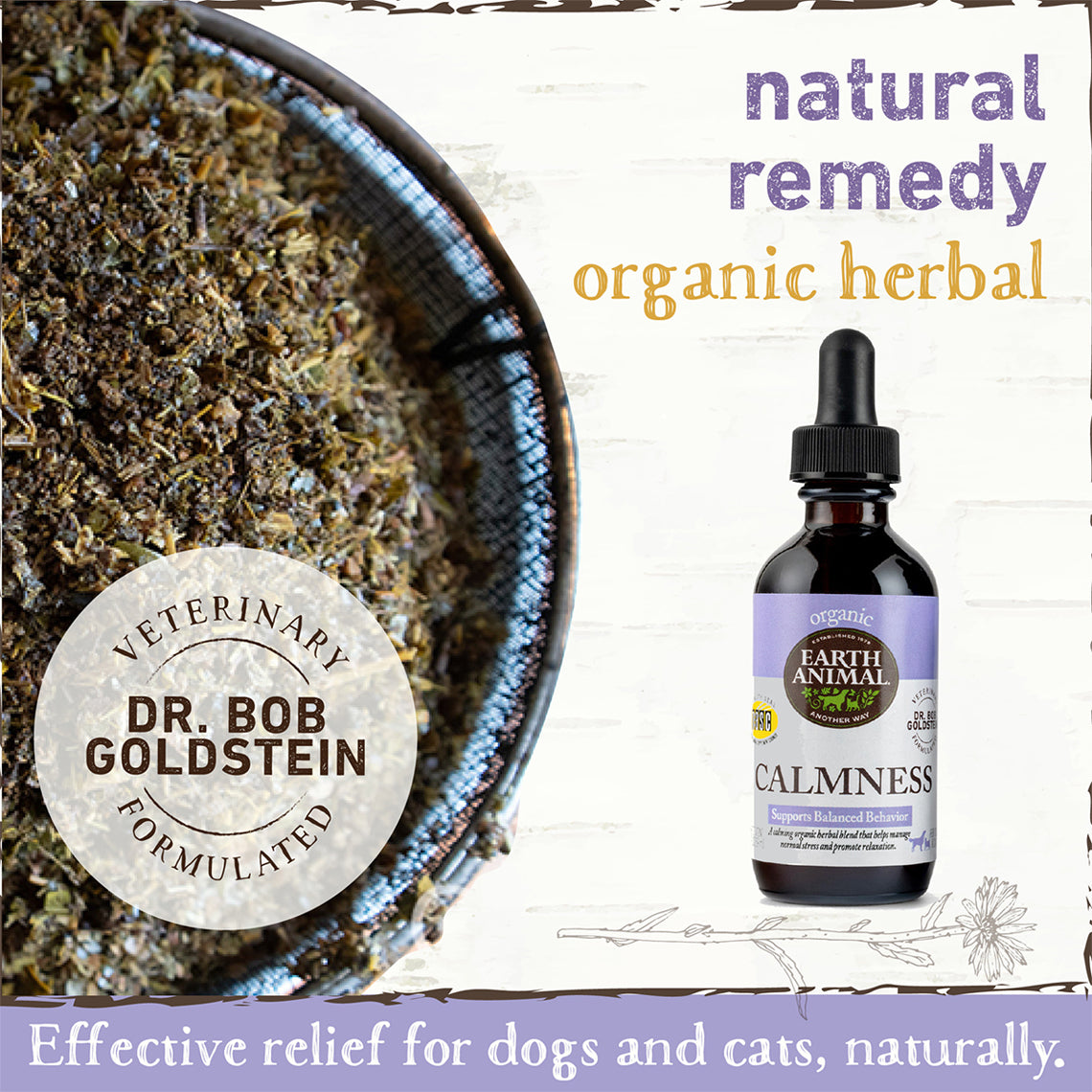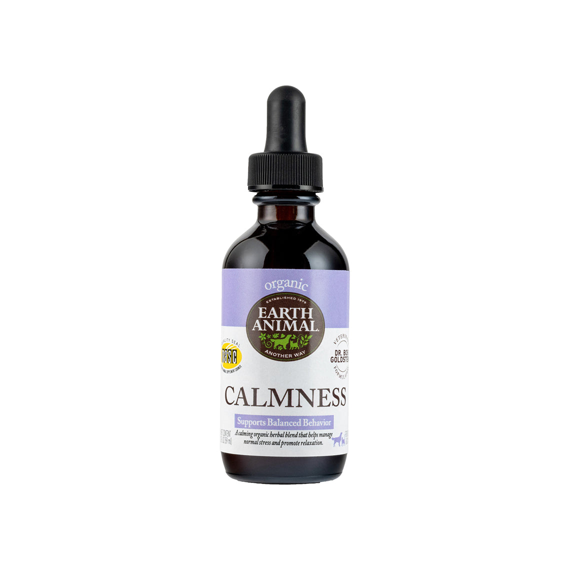 Earth Animal Organic Herbal Remedies Calmness Tincture for Dogs offers another way to heal with a relieving, organic herbal blend that supports balanced behavior, promotes a calming effect, helps manage normal stress and maintain contentment during separation, travel, and motion sickness caused by changes in your pet's daily routine.