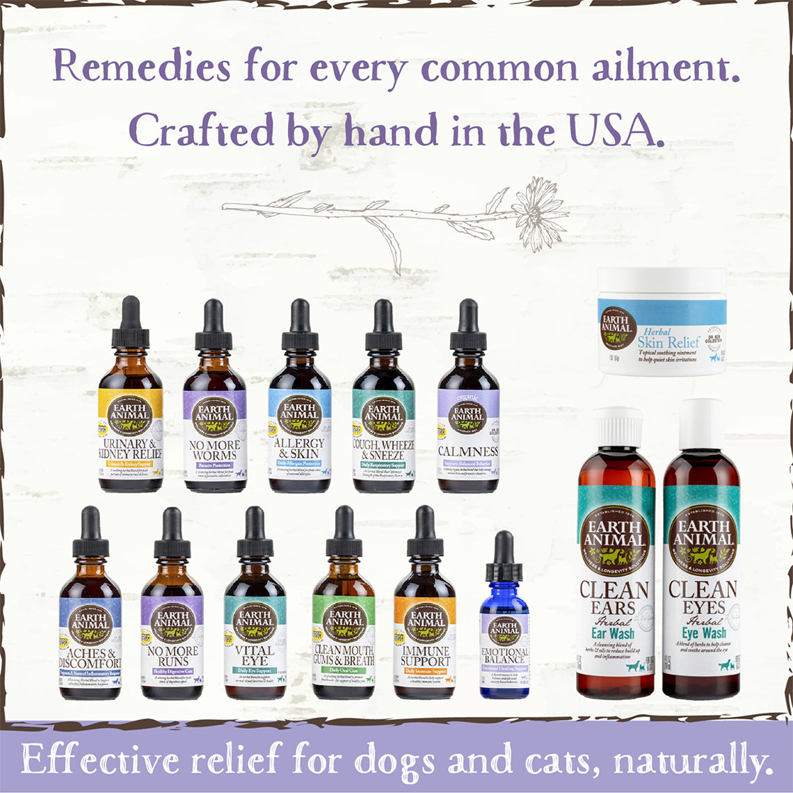 Hand-crafted in the Green Mountains of Vermont, Earth Animal's Herbal Remedies are made with plants that contain naturally occurring beneficial properties providing healing, comfort, and wellness for the most common conditions dogs and cats experience such as aches & discomfort, allergy & skin issues, anxiety, stress, nervousness, oral health, bad breath, coughing, wheezing, sneezing, immune support, diarrhea, worms, urinary support, kidney support, and eye irritation.