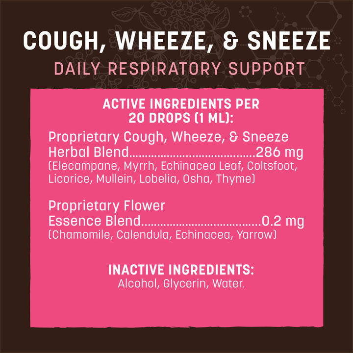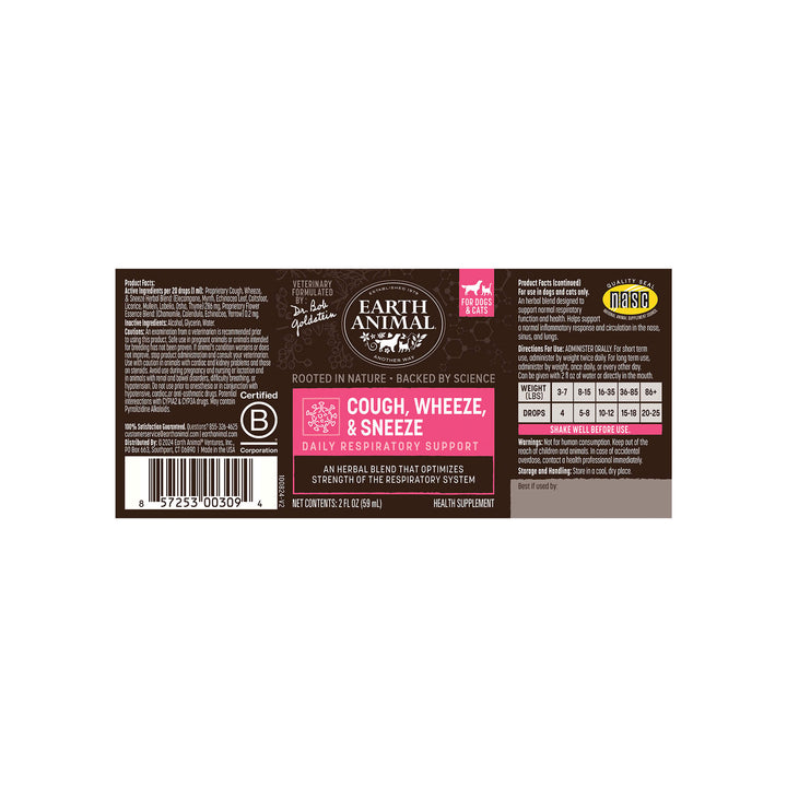 Earth Animal Organic Herbal Remedies Cough, Wheeze & Sneeze Tincture for Dogs offers another way to heal for pets who are prone to seasonal allergies. Infections, coughing, wheezing, & sneezing are also common during stressful times. This organic herbal blend supports respiratory function & health and enhances oxygen utilization.