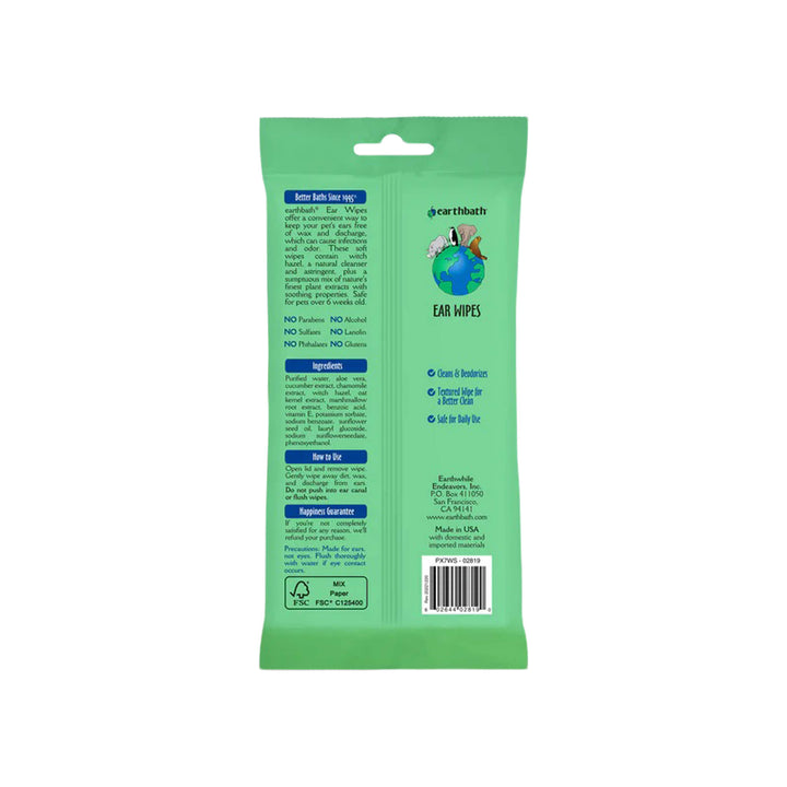 Earthbath Ear Wipes are a fast, convenient way to keep your pet's ears free of wax and discharge which can cause infections and odor. These wipes contain witch hazel, a natural cleanser and astringent, plus a sumptuous mix of nature's finest plant extracts with gentle therapeutic and deodorizing properties.Country of origin: USAManufacturer: Earthbath
