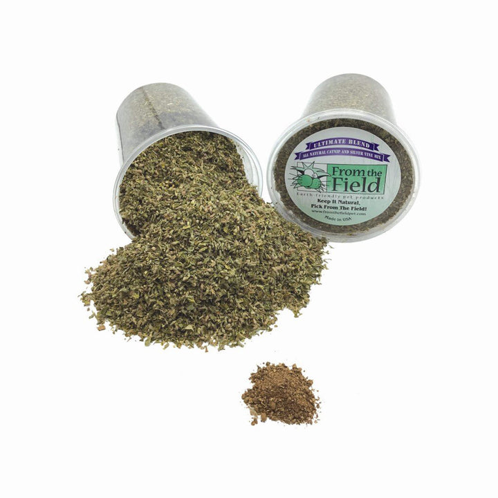 From the Field Ultimate Blend combines Leaf & Flower catnip—rich in nepetalactone—with ground silver vine fruit, which contains actinidine, a different natural compound that stimulates feline senses. The result is a powerful blend that energizes, excites, and entertains most cats.