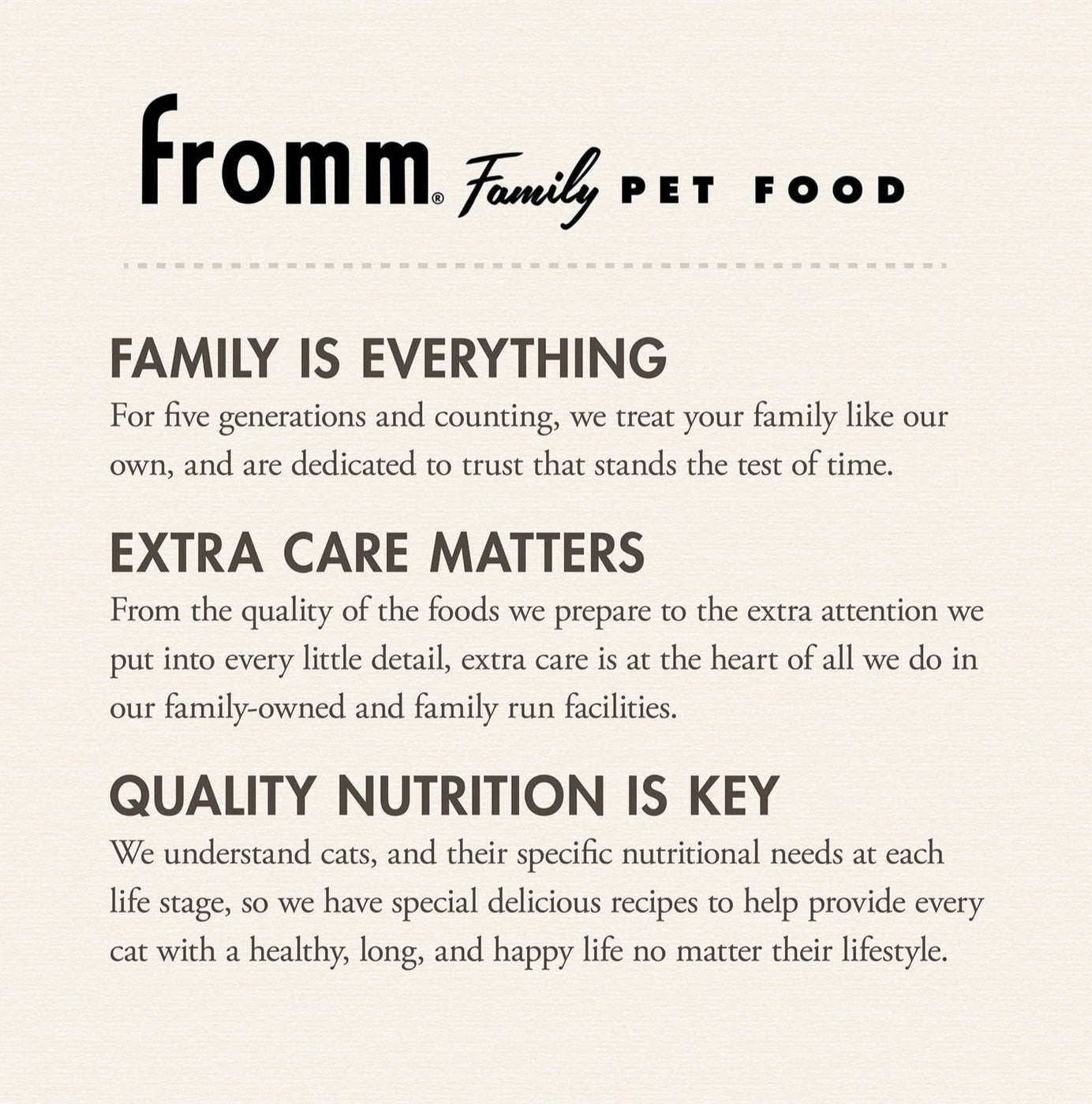 Fromm Gold Wet Cat Food provides your feline friend with a delicious and nutritious meal, made with high-quality proteins and wholesome ingredients. Produced at Fromm's family-owned facility, this wet cat food is the perfect complement to Fromm Gold dry formulas, delivering complete and balanced nutrition for normally active cats.