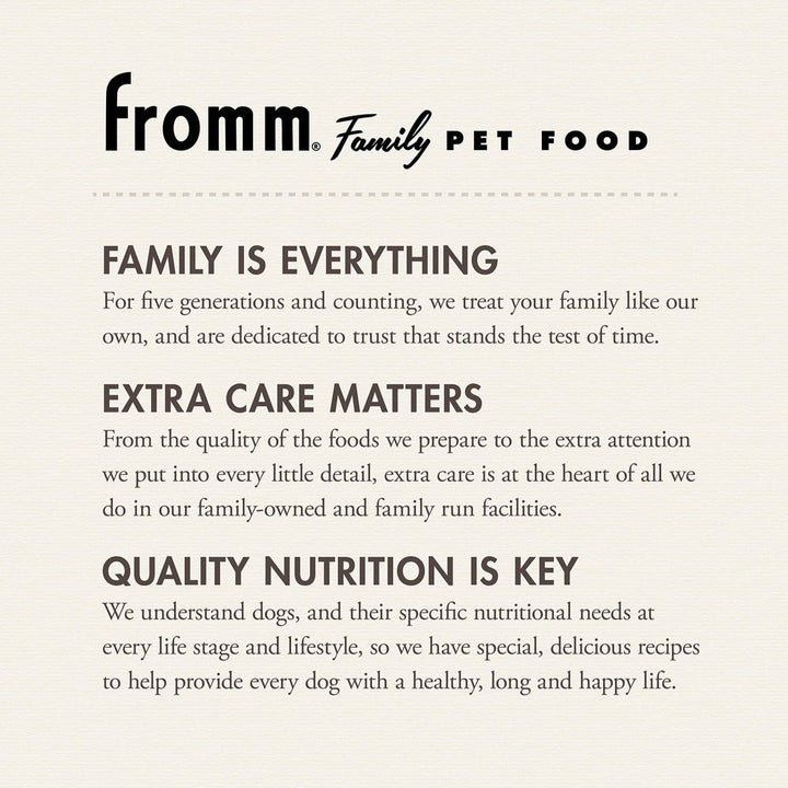 Produced at Fromm's family-owned facility, this grain-free formula boasts high nutrient digestibility and utilization, ensuring your dog gets the most from every bite. Additionally, every batch undergoes third-party pathogenic bacteria testing for safety and quality. The inclusion of Fromm's specially developed probiotics supports digestive health and enhances nutrient absorption.