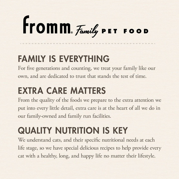 Produced at Fromm's family-owned facility, this cat food guarantees high nutrient digestibility and utilization, with rigorous third-party pathogenic bacteria testing on all production batches. The formula includes Fromm's specially developed blend of probiotics to support intestinal health and enhance nutrient metabolism.