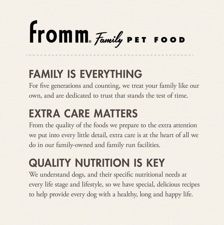 Enhanced with probiotics, this formula promotes digestive health, while omega-rich ingredients support a healthy skin and coat. Produced at Fromm's family-owned facility, this food guarantees high nutrient digestibility and utilization, with every batch undergoing rigorous third-party pathogenic bacteria testing for safety and quality.