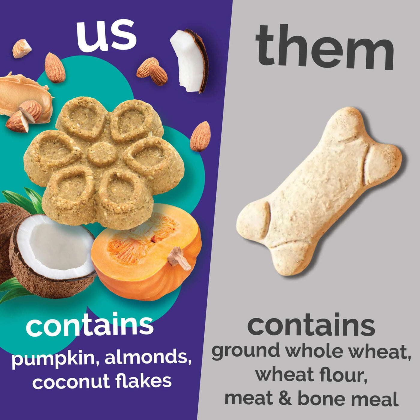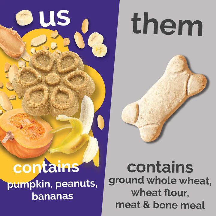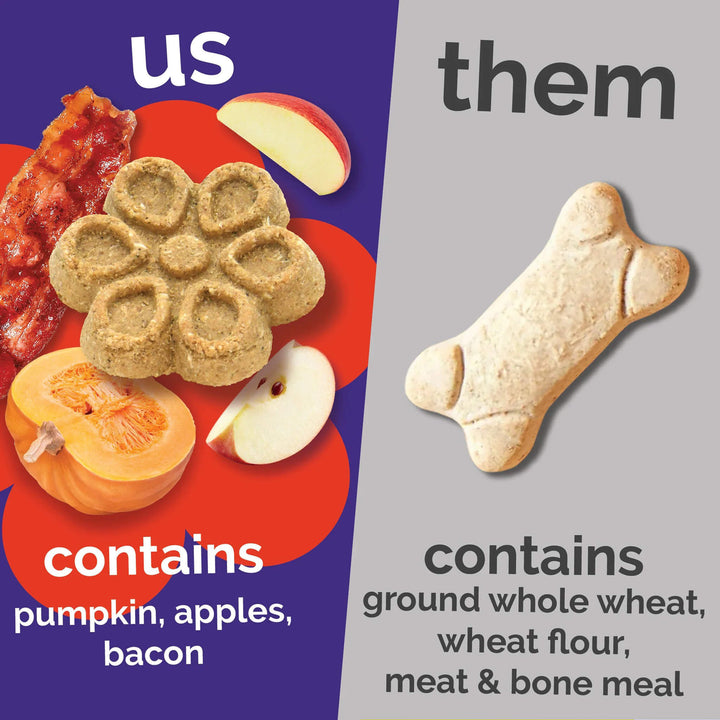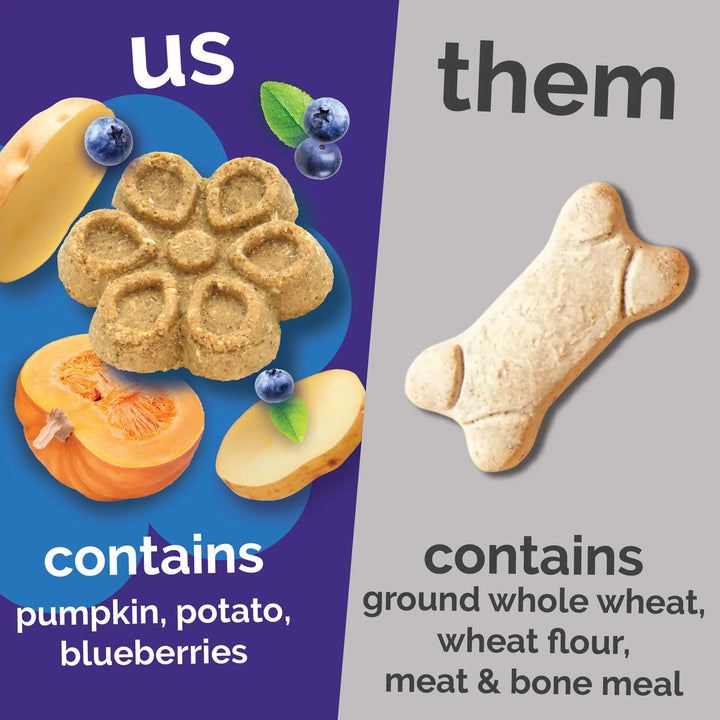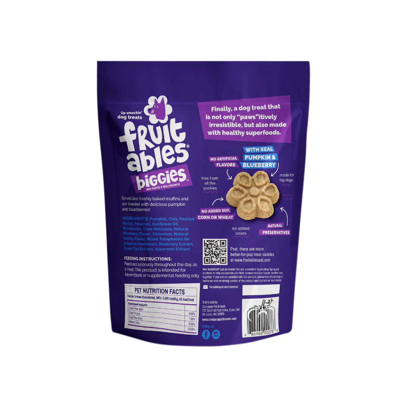 Fruitables Biggies Dog Treats deliver twice the flavor and crunch in every bite. These crunchy dog treats with fruits & veggies combine natural ingredients like apples, pumpkin, and blueberries for a wholesome snack dogs love.
