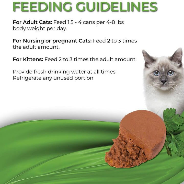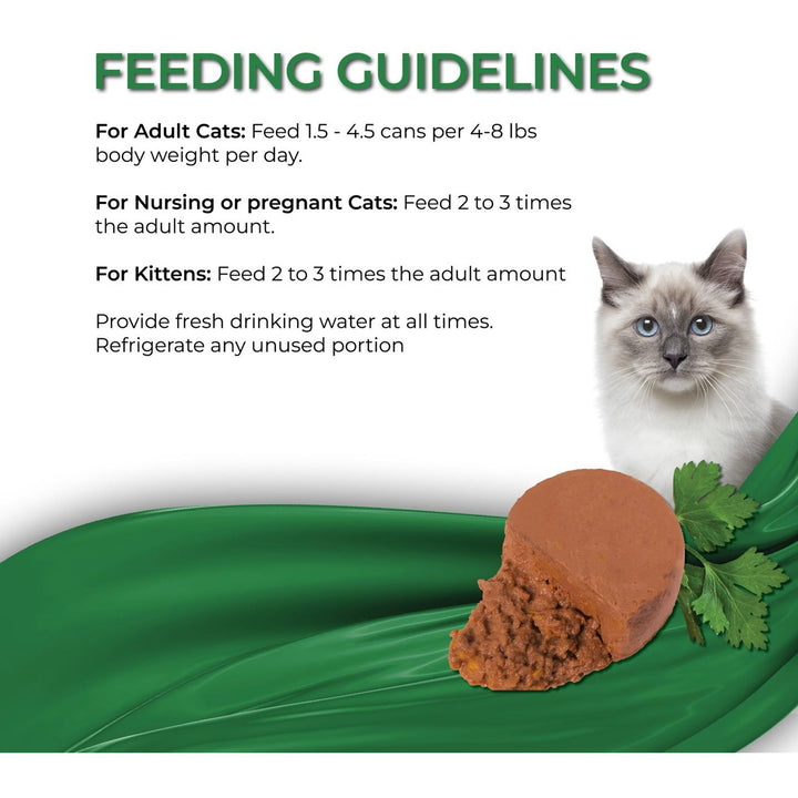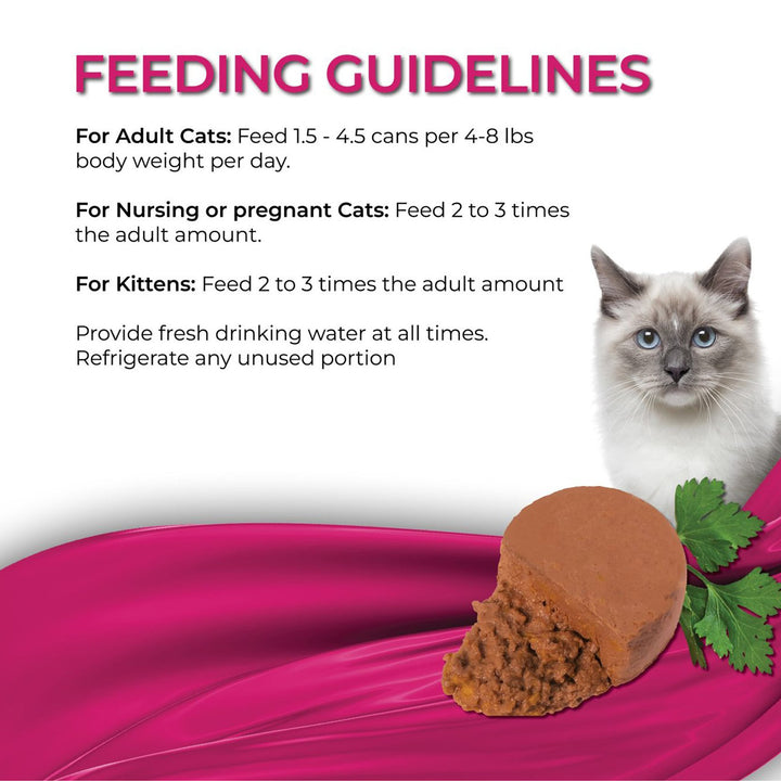 For Adult Cats feed 1.5 - 4.5 cans per 4-8 lbs body weight per day. For Nursing or pregnant animals feed 2 to 3 times the adult amount For Kittens feed 2 to 3 times the adult amount Provide fresh drinking water at all times. Refrigerate any unused portion.