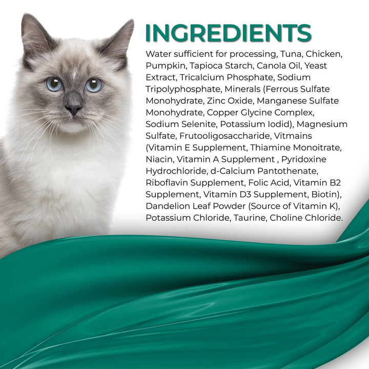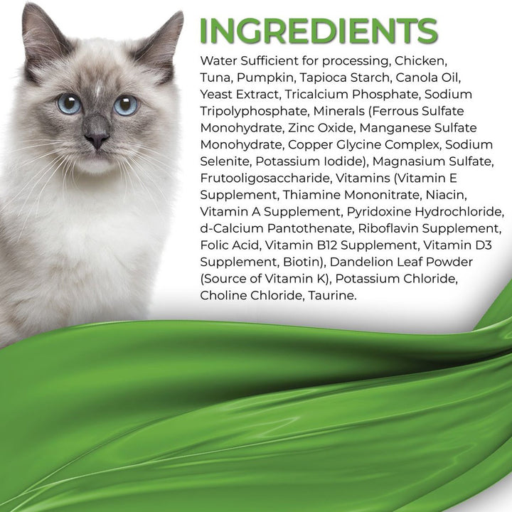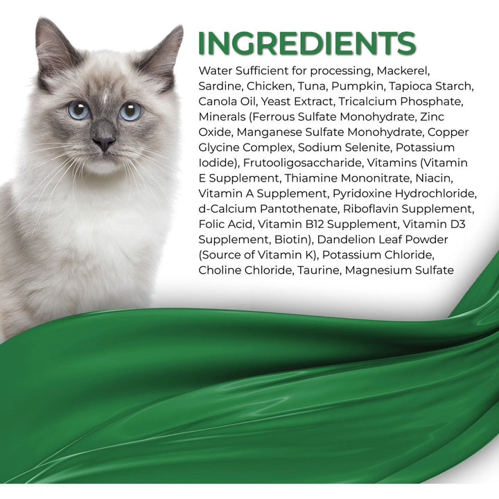 Water Sufficient for Processing, Mackerel, Sardine, Chicken, Tuna, Pumpkin, Tapioca Starch, Canola Oil, Yeast Extract, Tricalcium Phosphate, Minerals (Ferrous Sulfate Monohydrate, Zinc Oxide, Manganese Sulfate Monohydrate, Copper Glycine Complex, Sodium Selenite, Potassium Iodide), Fructooligosaccharide, Vitamins (Vitamin E Supplement, Thiamine Mononitrate, Niacin, Vitamin A Supplement, Pyridoxine Hydrochloride, D-Calcium Pantothenate, Riboflavin Supplement, Folic Acid, Vitamin B12 Supplement, Vitamin D3 Supplement, Biotin), Dandelion Leaf Powder (Source Of Vitamin K), Potassium Chloride, Choline Chloride, Taurine, Magnesium Sulfate