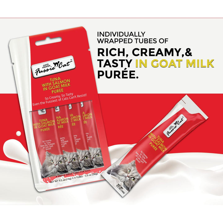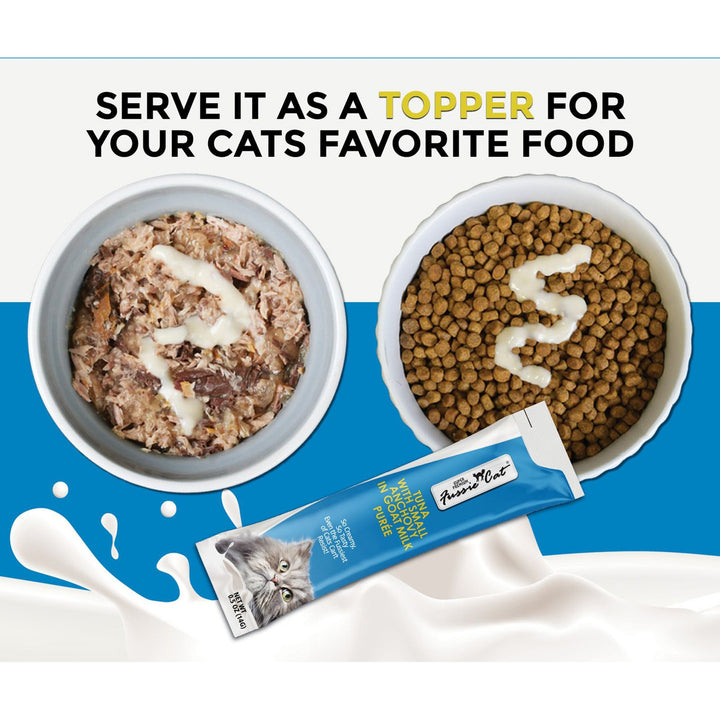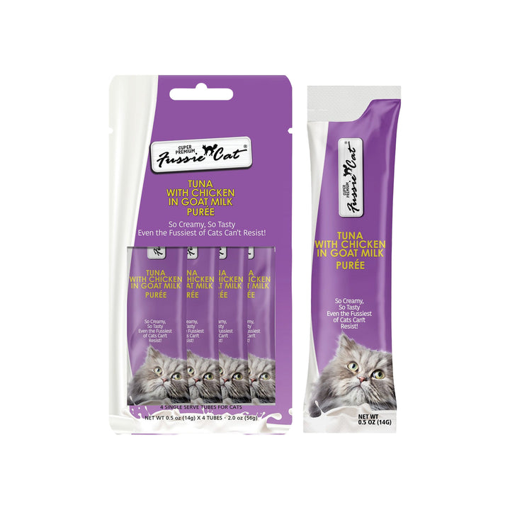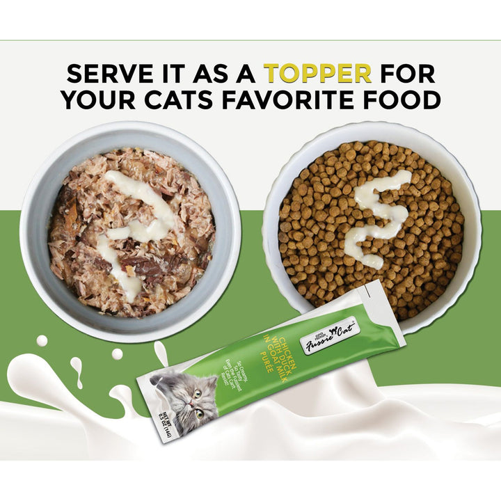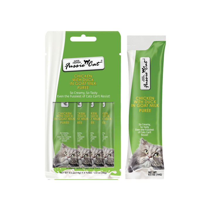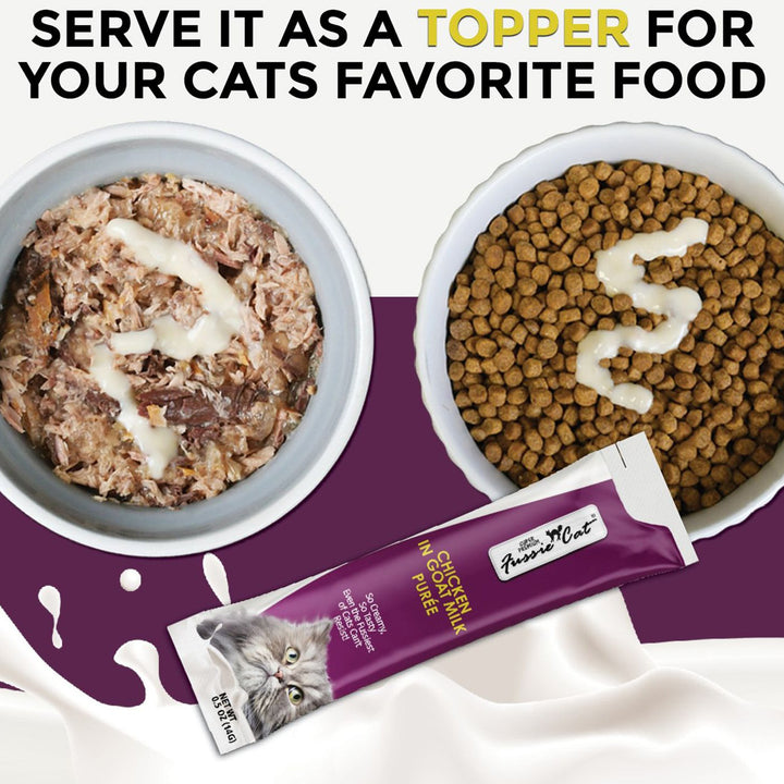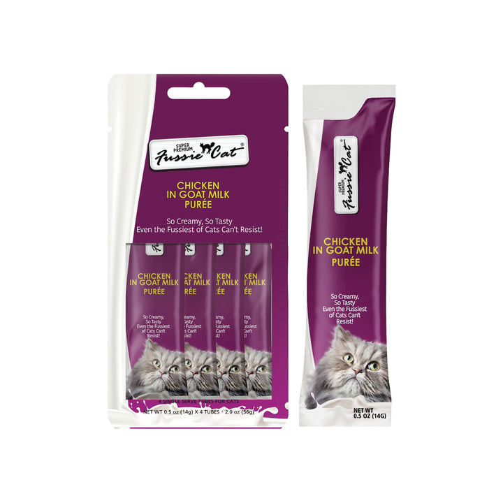 Try Fussie Cat Premium Puree in Goat Milk Lickable Cat Treats today!