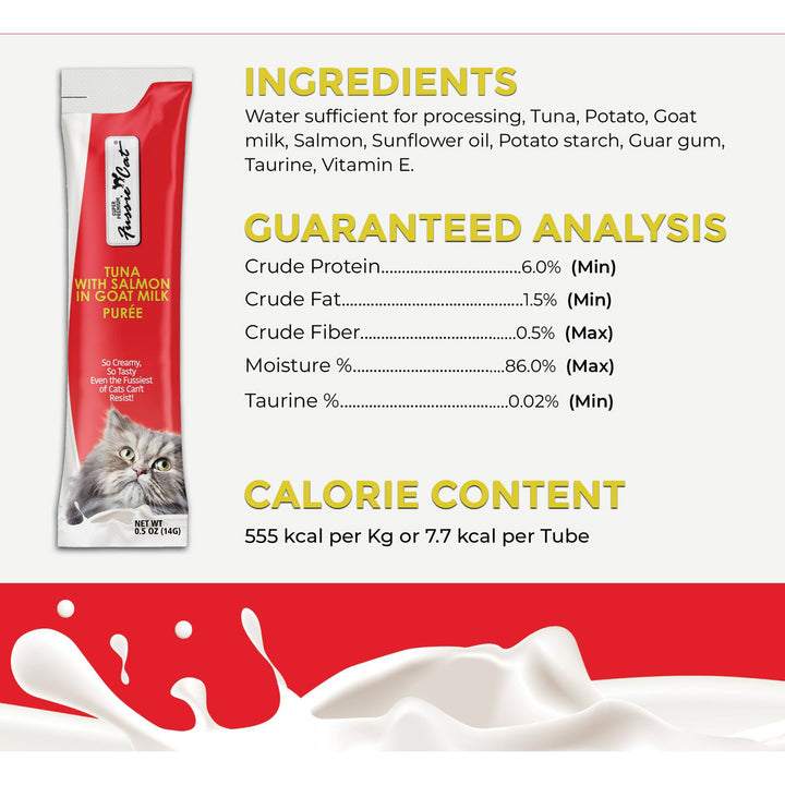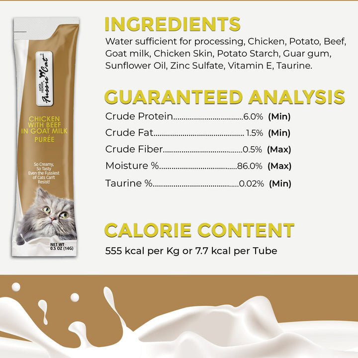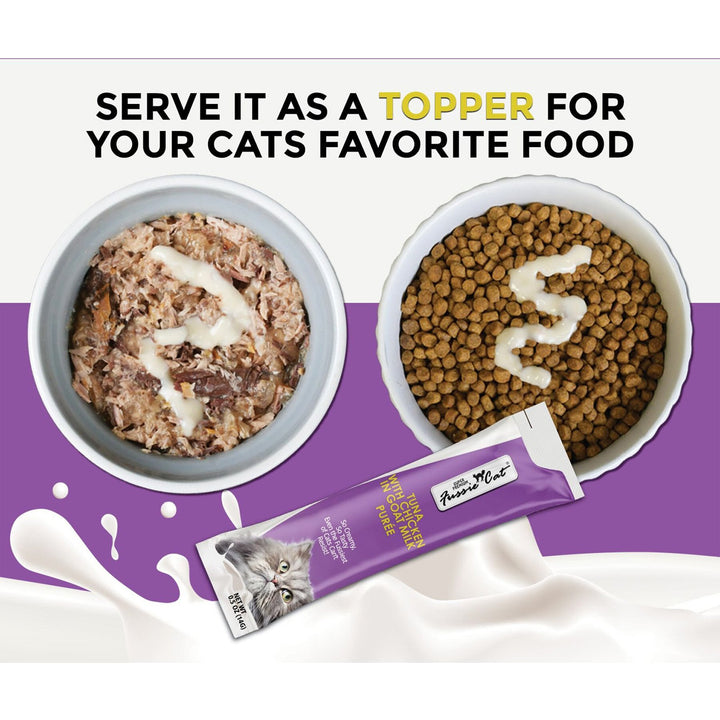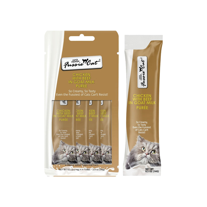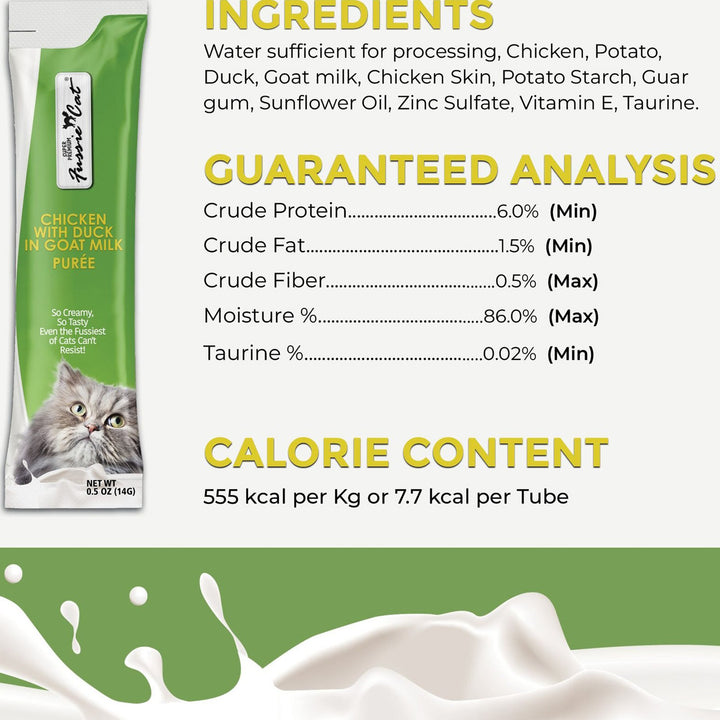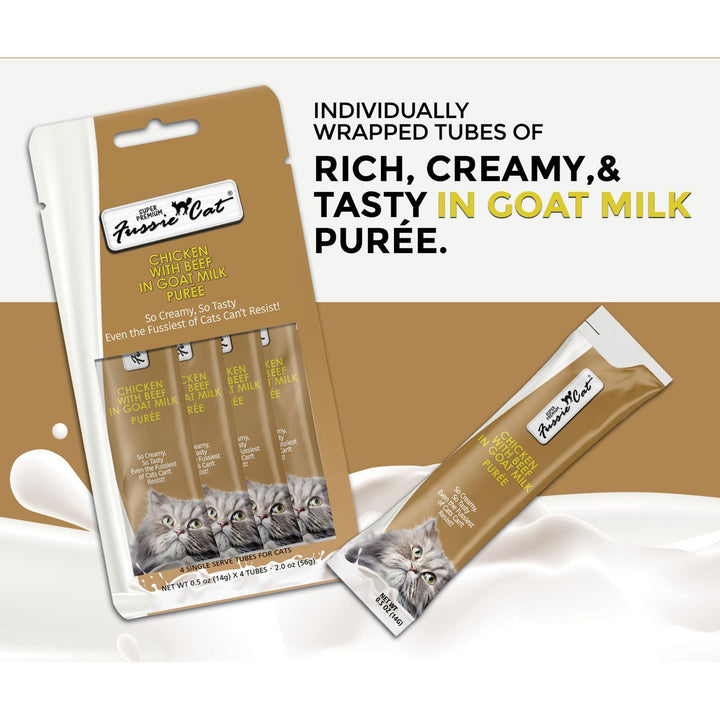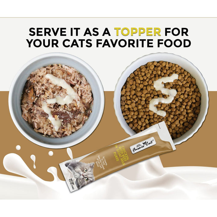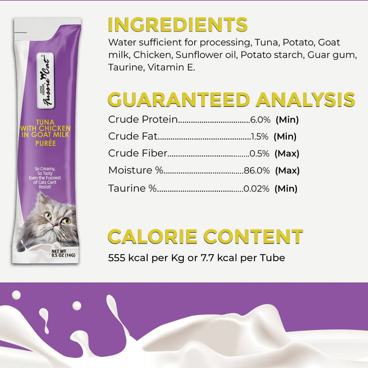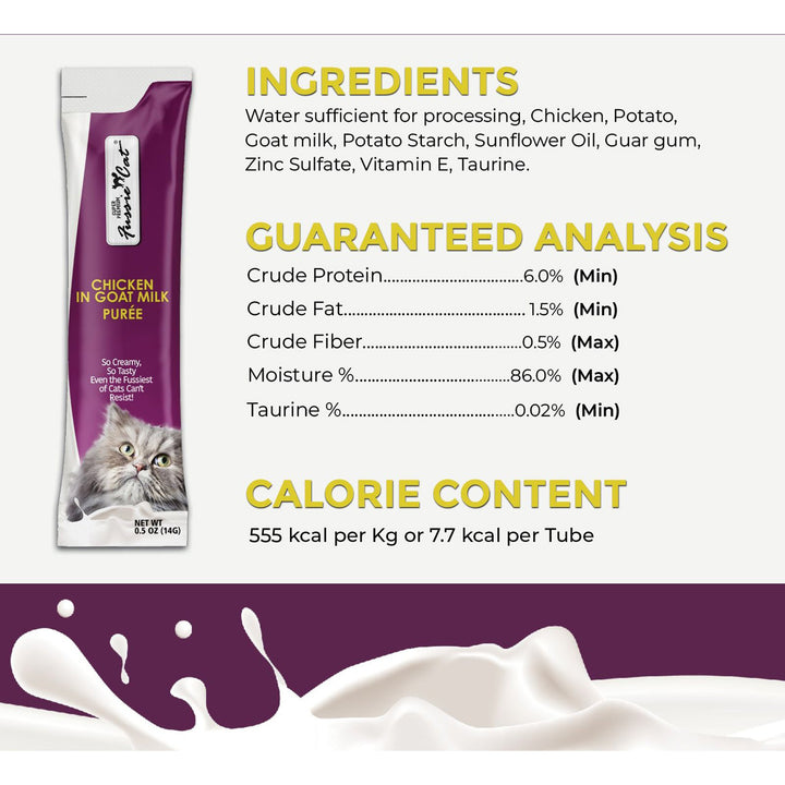 Fussie Cat Premium Puree in Goat Milk Lickable Cat Treats offers a rich and creamy treat experience for your feline companion. Made with a velvety goat milk base, this smooth purée delivers both irresistible flavor and nourishing benefits in every lickable serving.