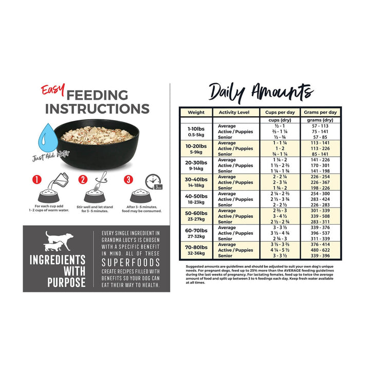 Every single ingredient in Grandma Lucy's is chosen with a specific benefit in mind. All of these superfoods create recipes filled with benefits so your dog can eat their way to health.