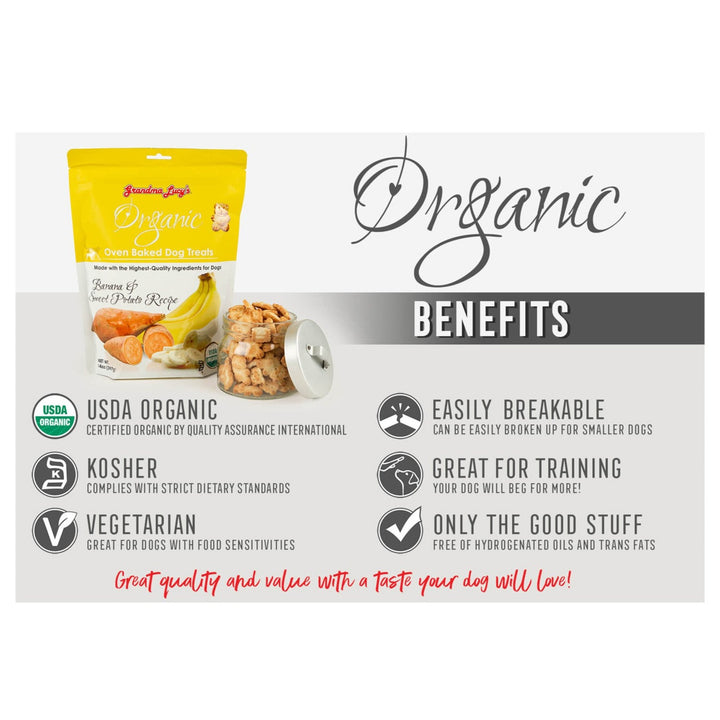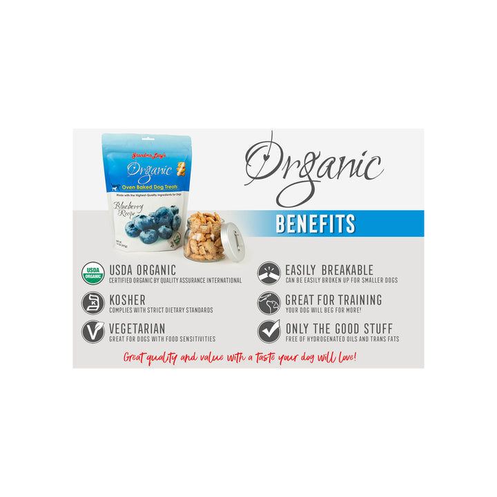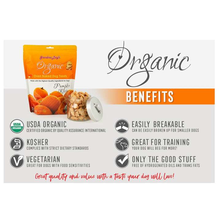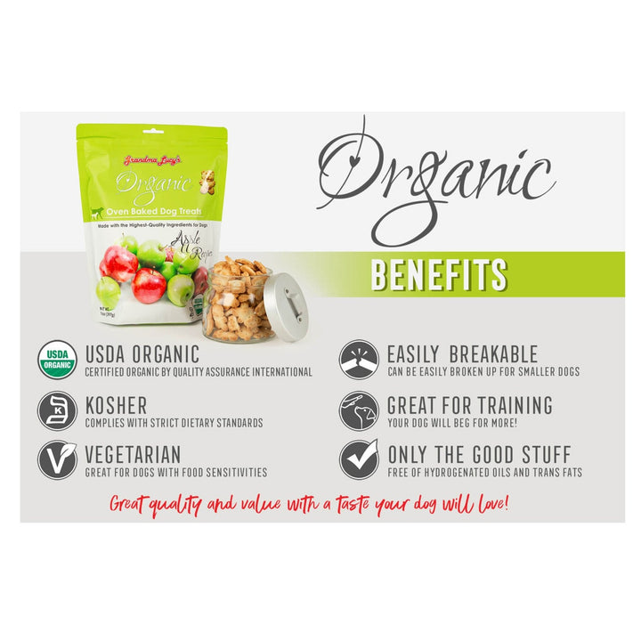 Grandma Lucy's Organic Oven Baked Dog Treats are sure to become your pet's new favorite snack. Made with 100% organic, human-quality ingredients, these treats offer a delicious taste that dogs can't resist. With a low-protein content, they're suitable for indulging your pet without worry. Your dog will love the irresistible flavor so much that they'll beg for more, making these treats a must-have in your pet's treat rotation. As an organic treat option, you can feel confident giving them to your pet, knowing they're made with love and quality ingredients. It's love at first bite with Grandma Lucy's Organic Oven-Baked Dog Treats!