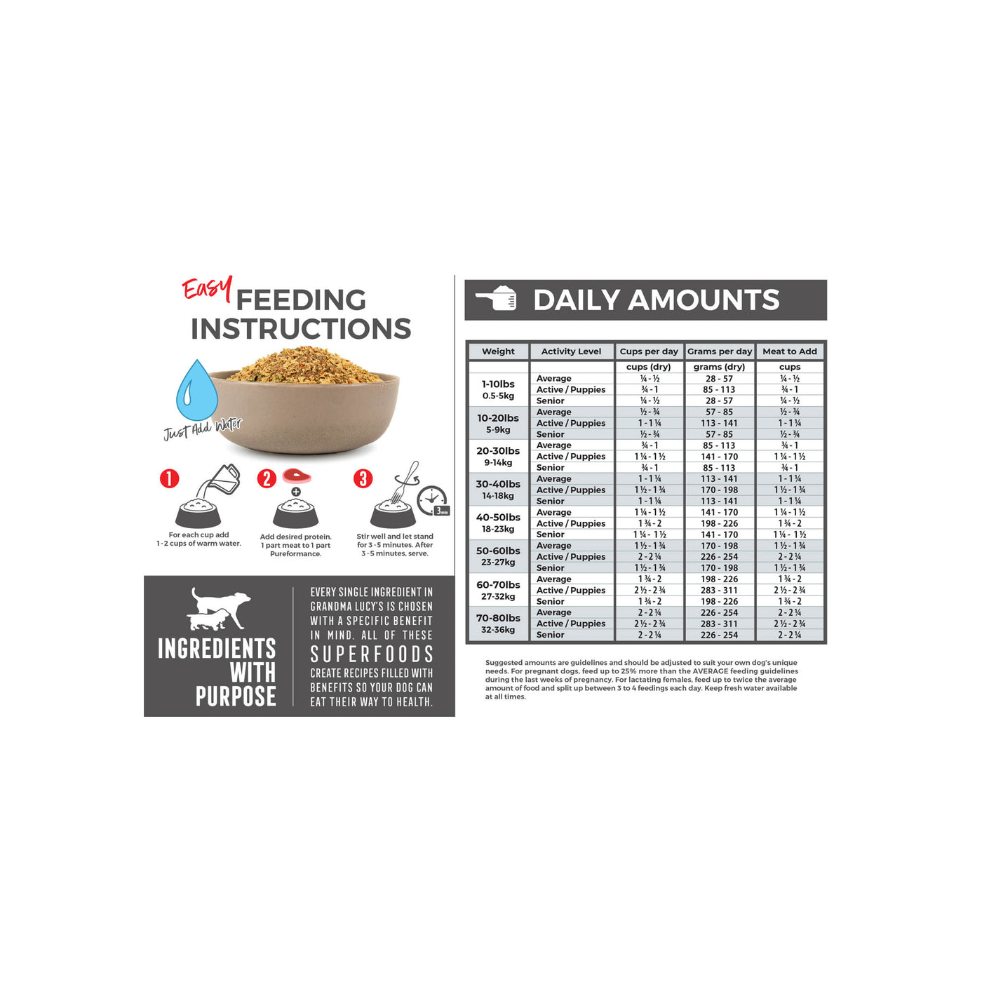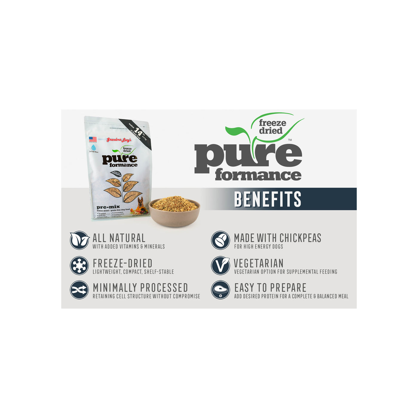 Grandma Lucy's PUREformance Pre-mix & Chickpea Dog Food is designed to fuel your pet's active lifestyle. Packed with high-quality ingredients, it provides the essential nutrients needed for your pet's healthy energy levels during activities like catch and hiking. This innovative freeze-dried formula combines unique proteins with highly nutritious chickpeas, fruits, and vegetables, ensuring a balanced and flavorful diet for your furry friend. Chickpeas, known for their fiber and protein content, offer sustained energy release, keeping your pet lively and engaged. With simple ingredients and convenient preparation, PUREformance brings the best nutrition to your pet in one easy-to-use bag, guaranteeing joyous jumps and boundless excitement!