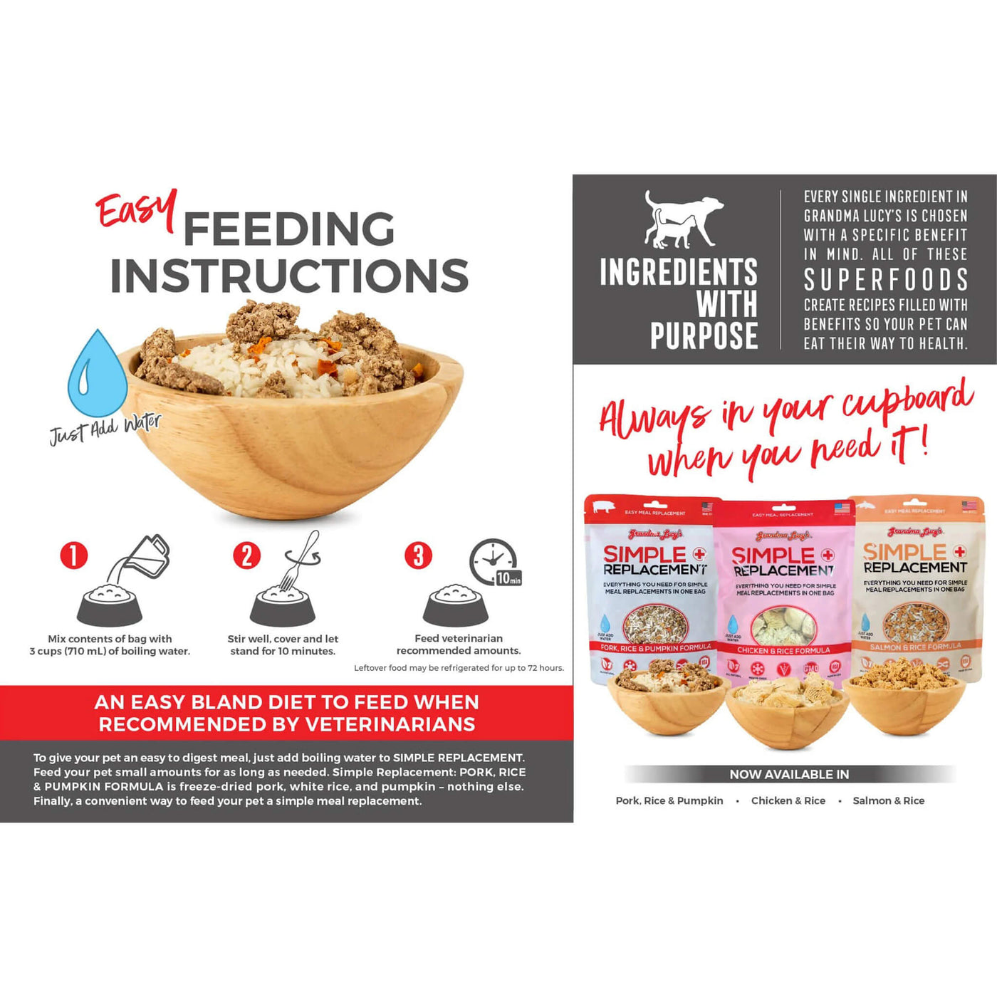 Grandma Lucy’s Simple Replacement is a gentle solution for dogs experiencing digestive upset or recovering from illness. This freeze dried bland diet meal for dogs provides wholesome nutrition made with simple, limited ingredients that are easy to digest and comforting to eat.