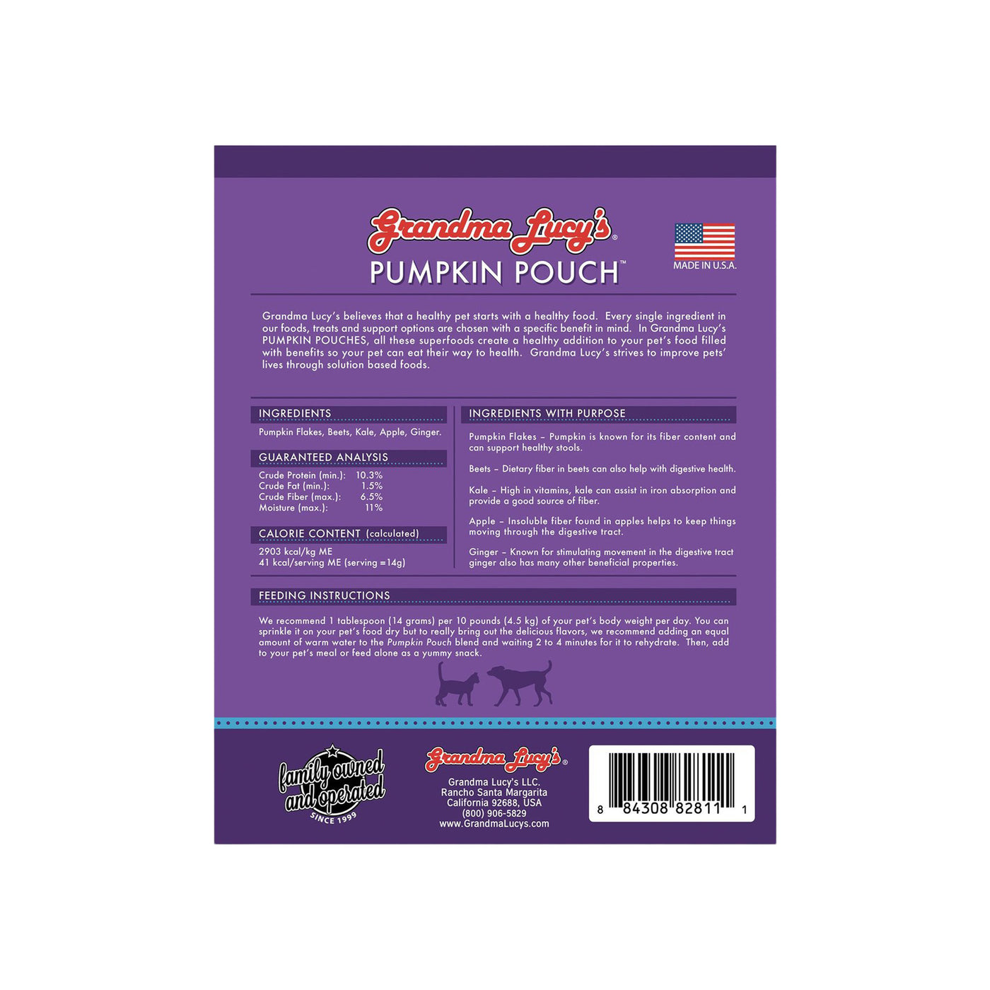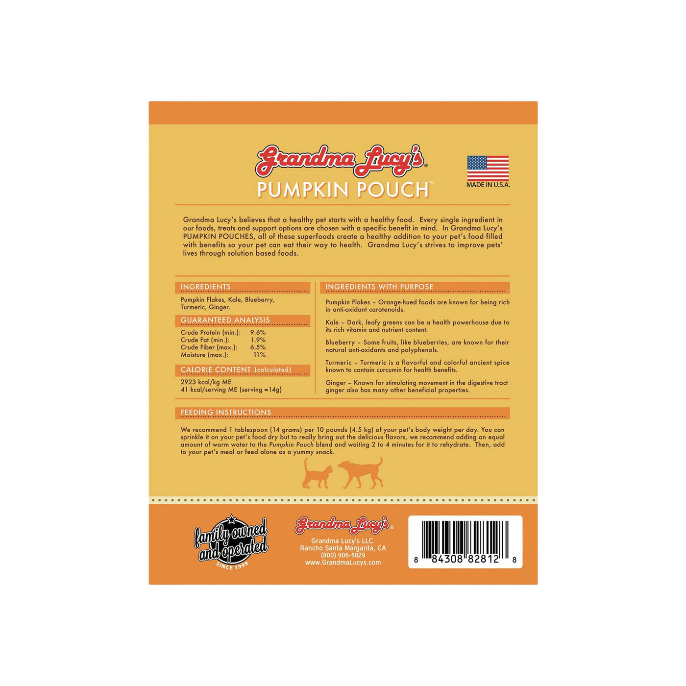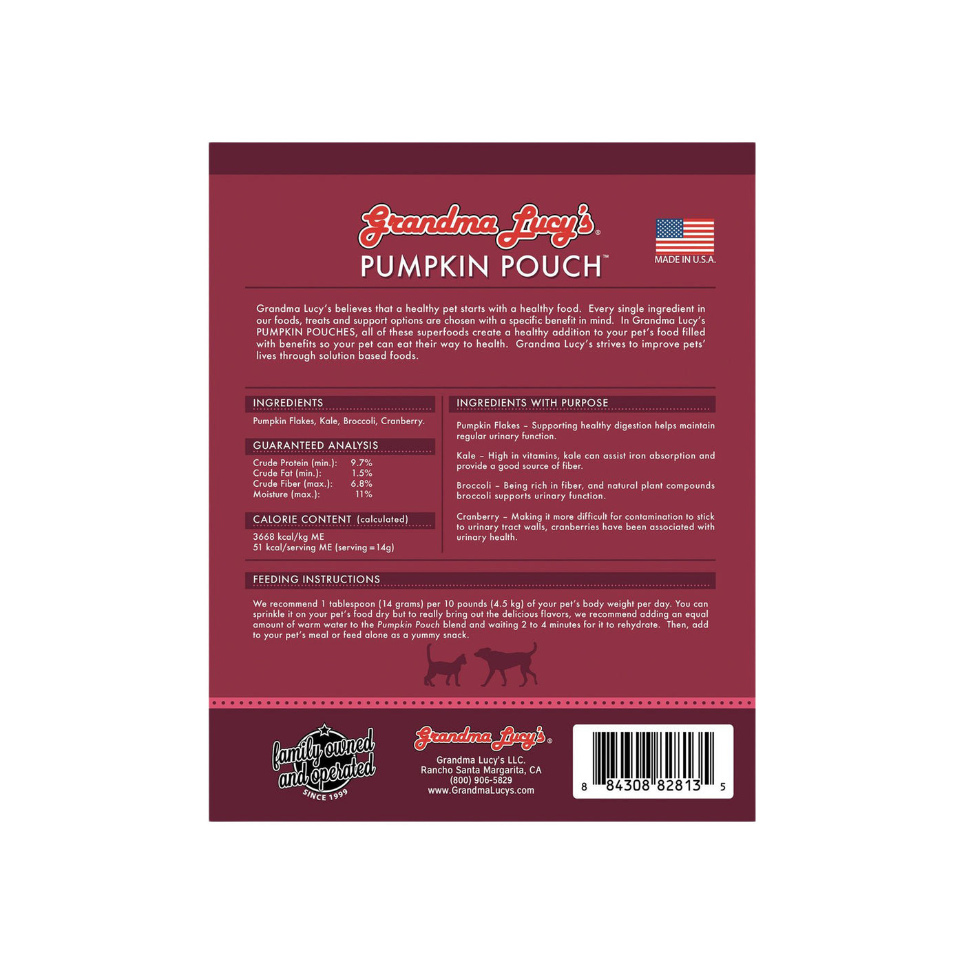 Grandma Lucy's Supplement for Dogs & Cats provides your pet with an extra boost of nutrition for their overall health and well-being. With a focus on thoughtful ingredient selection, each component is chosen with a specific benefit in mind, ensuring optimal nutrition. The Pumpkin Pouches contain a blend of superfoods, offering a nutritious addition to your pet's diet. Whether added to their food or mixed with water for a treat, Pumpkin Pouches offer versatility in usage. Packed with benefits, they allow your pet to eat their way to health, supporting their vitality and overall wellness.